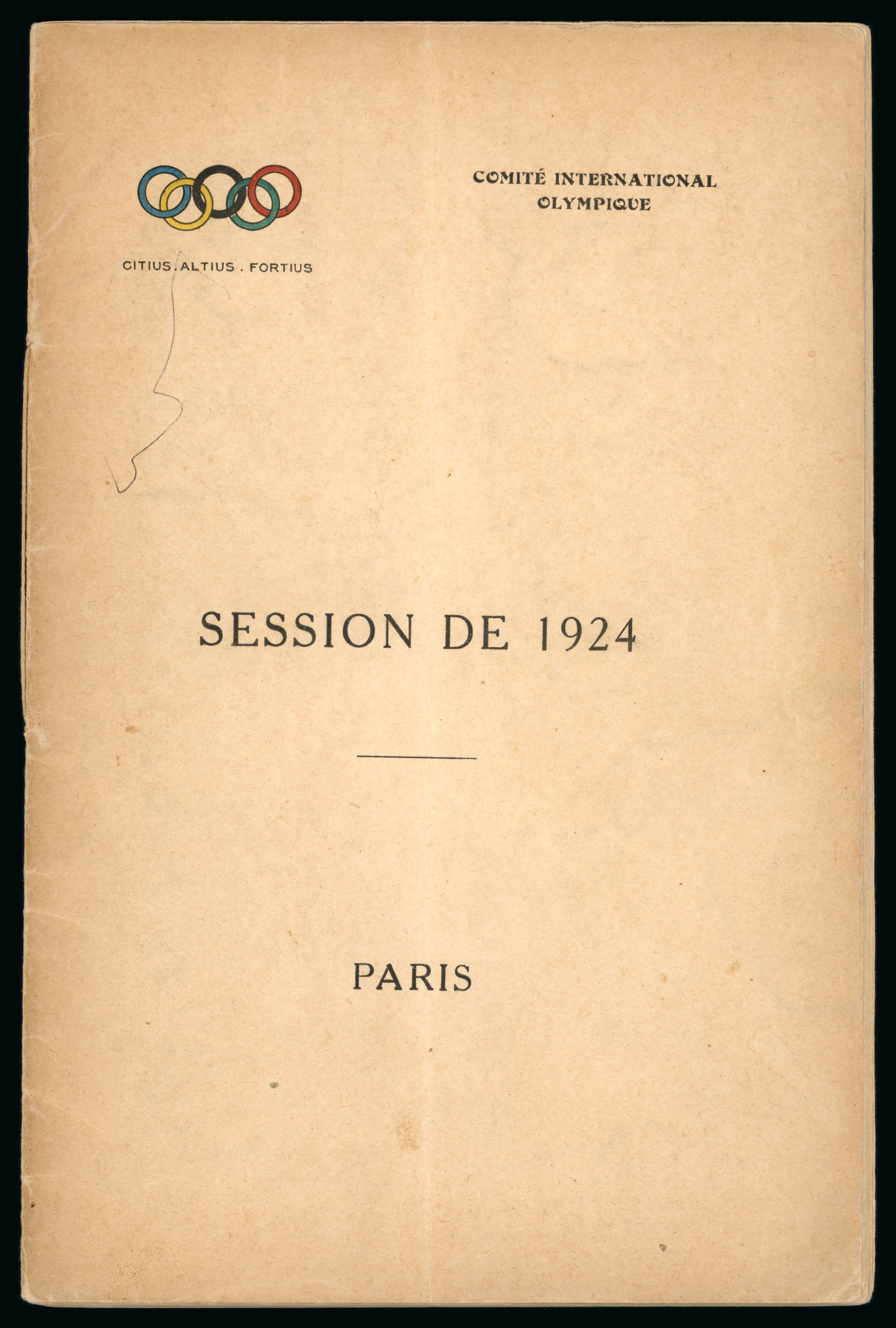 1924 IOC Session in Paris report, 31pp, in French, incl. celebration of the 30th anniversary of the reestablishment of the modern Olympic Games, daily report on sessions, etc., very fine. (Image 1)