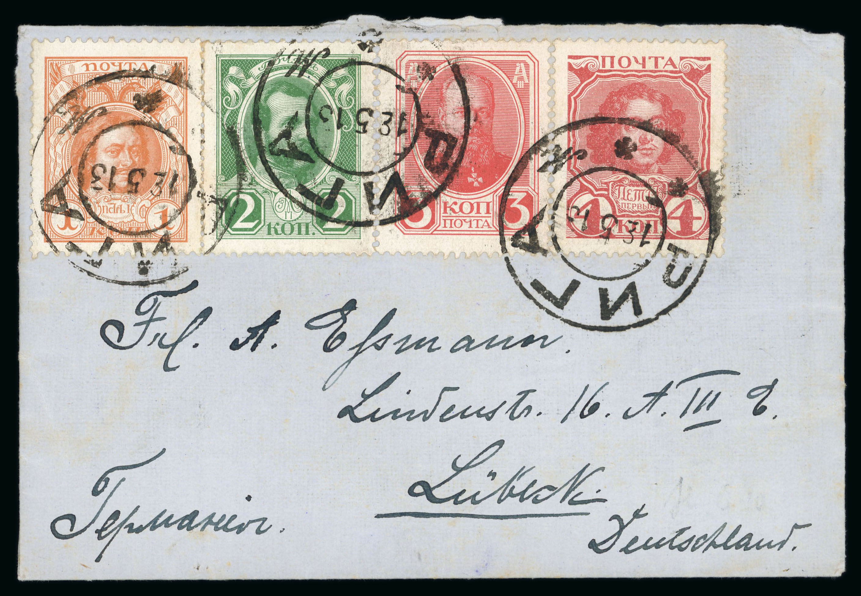 1914 Second Russian Olympiad in Riga publicity vignette tied to reverse of envelope by "XXe ANNIVERSAIRE DU RETABLISSEMENT DES JEUX OLYMPIQUES 1894-1914" black cachet, sent from Riga (13.5.13) to Germany with Romanov 1k, 2k, 3k and 4k,