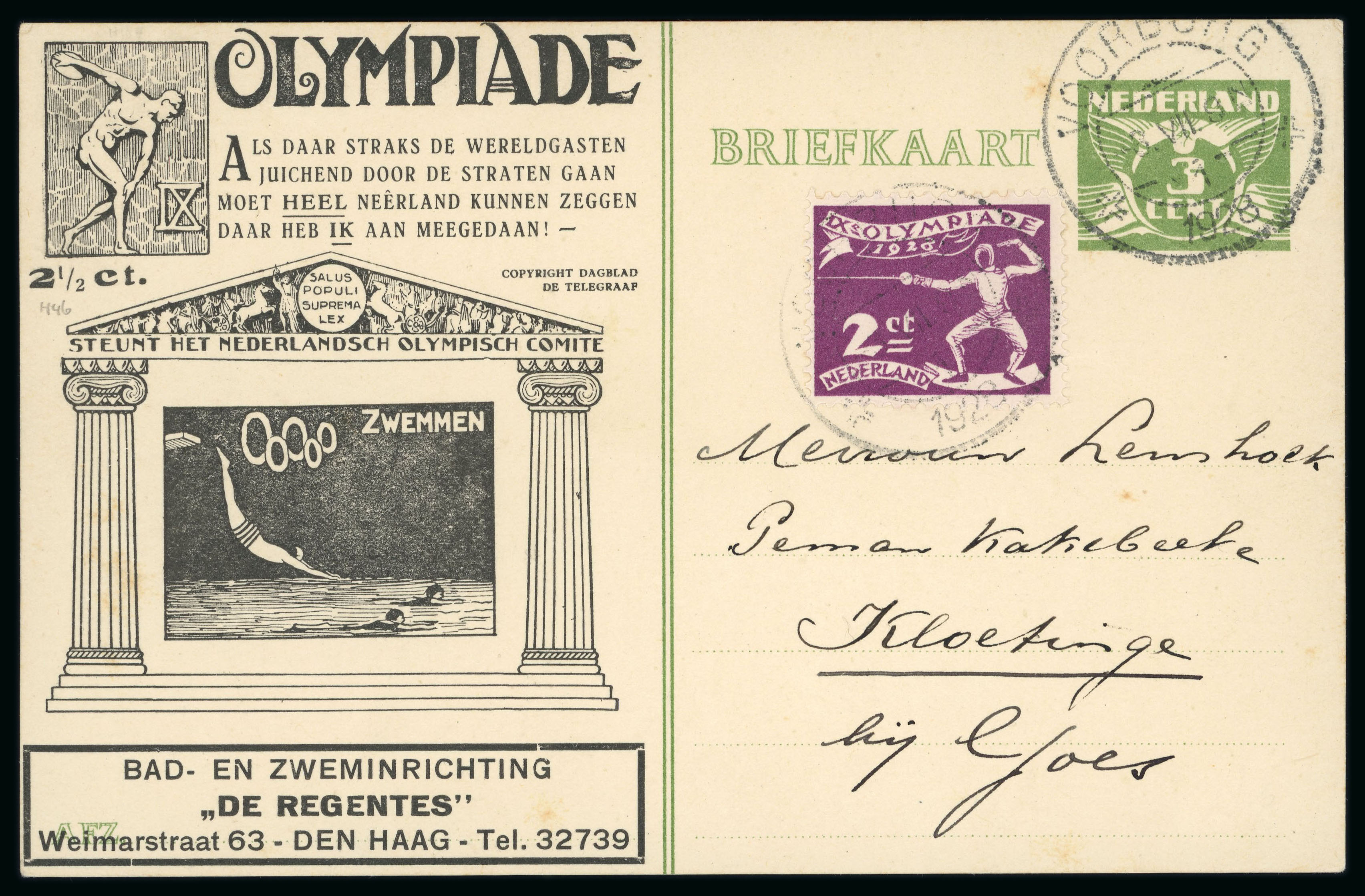 Organising Committee printed envelope with strip of three 25c, some Olympic cancels, 1928 incl. airmails, express, Huygens "Swimming" stationery card uprated, 1932 incl. bisect 2c in pair paying 3c rate, 1936 incl. several express, scarce "Po"
