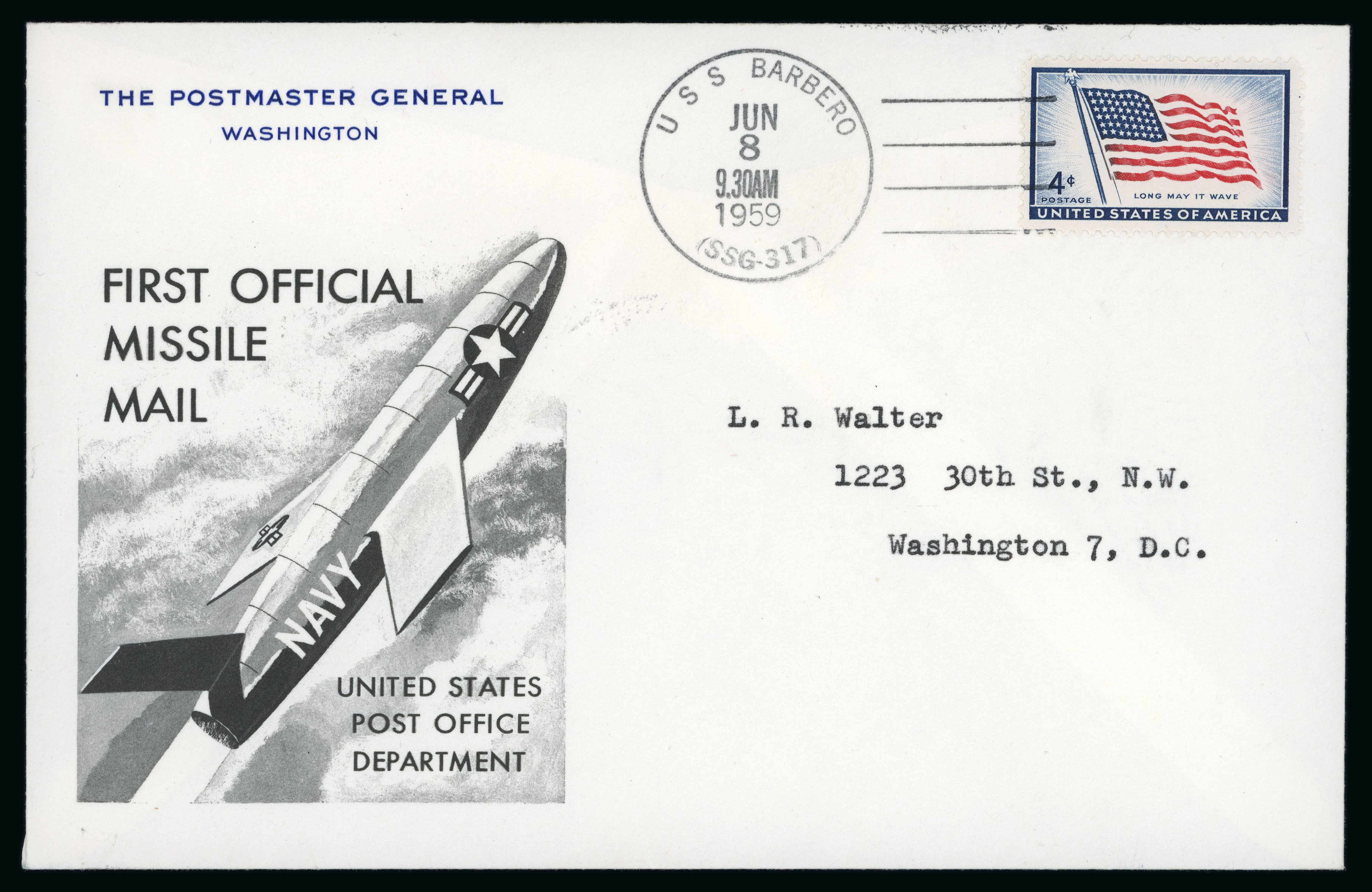 1959 USA first official missile mail "USS Babero" printed cover with 4c tied by USS Barbero duplex, Jacksonville arrival, plus letter from the Postmaster General. (Image 1)