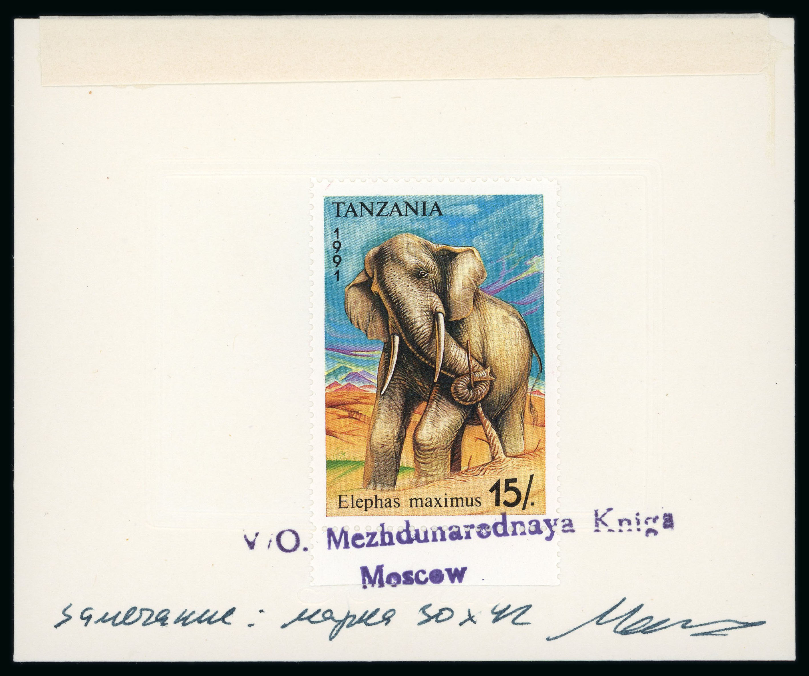 1991 Elephant set of seven values and miniature sheet, all of unissued design, individually mounted onto embossed card bearing signature and handstamp of the Moscow printers, the handstamp sometimes touching design, only a