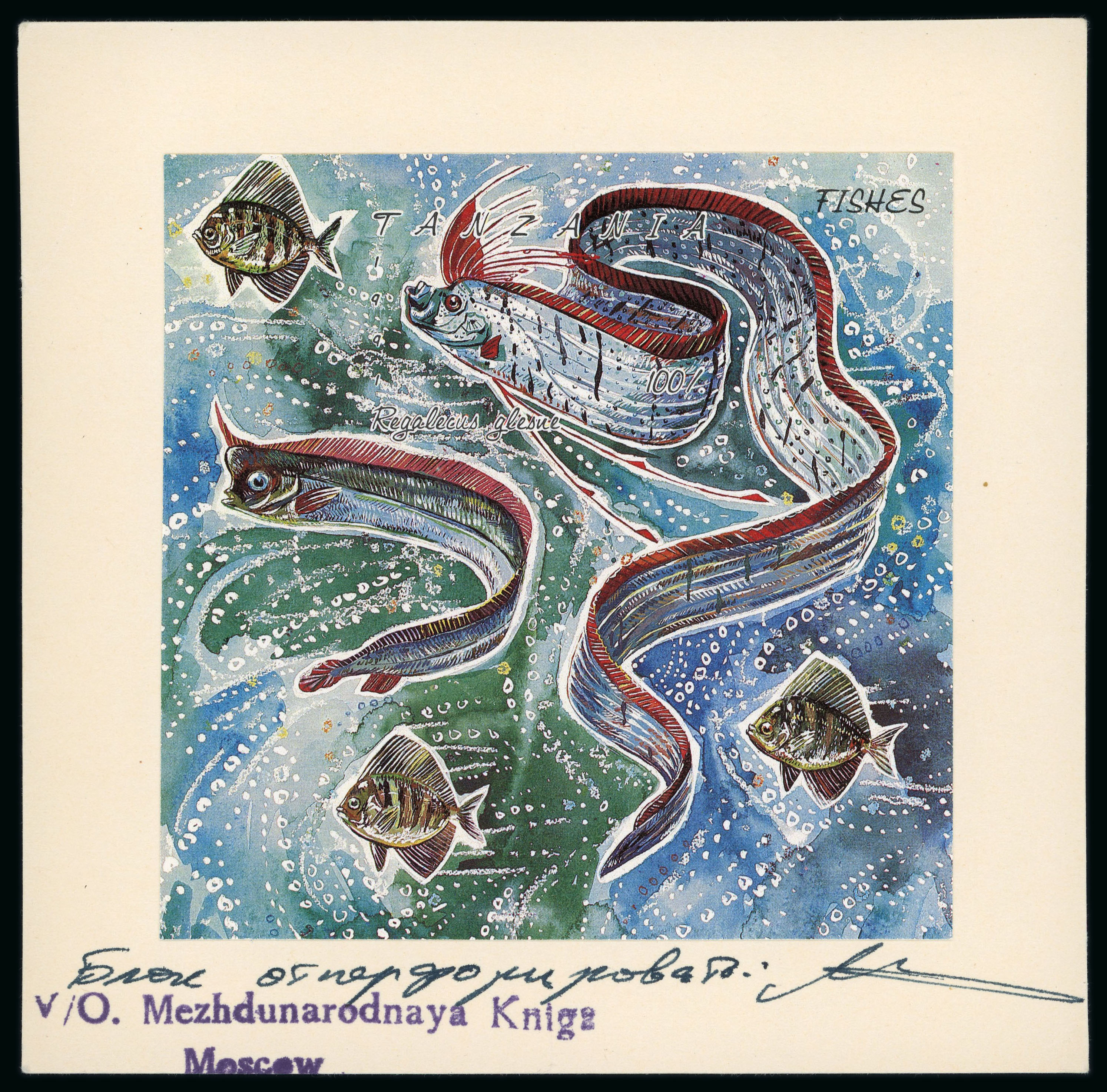 1991 Fish miniature sheet of unissued design with regard to inscriptions, individually mounted onto embossed card bearing signature and handstamp of the Moscow printers, only a handful exist. (Image 1)