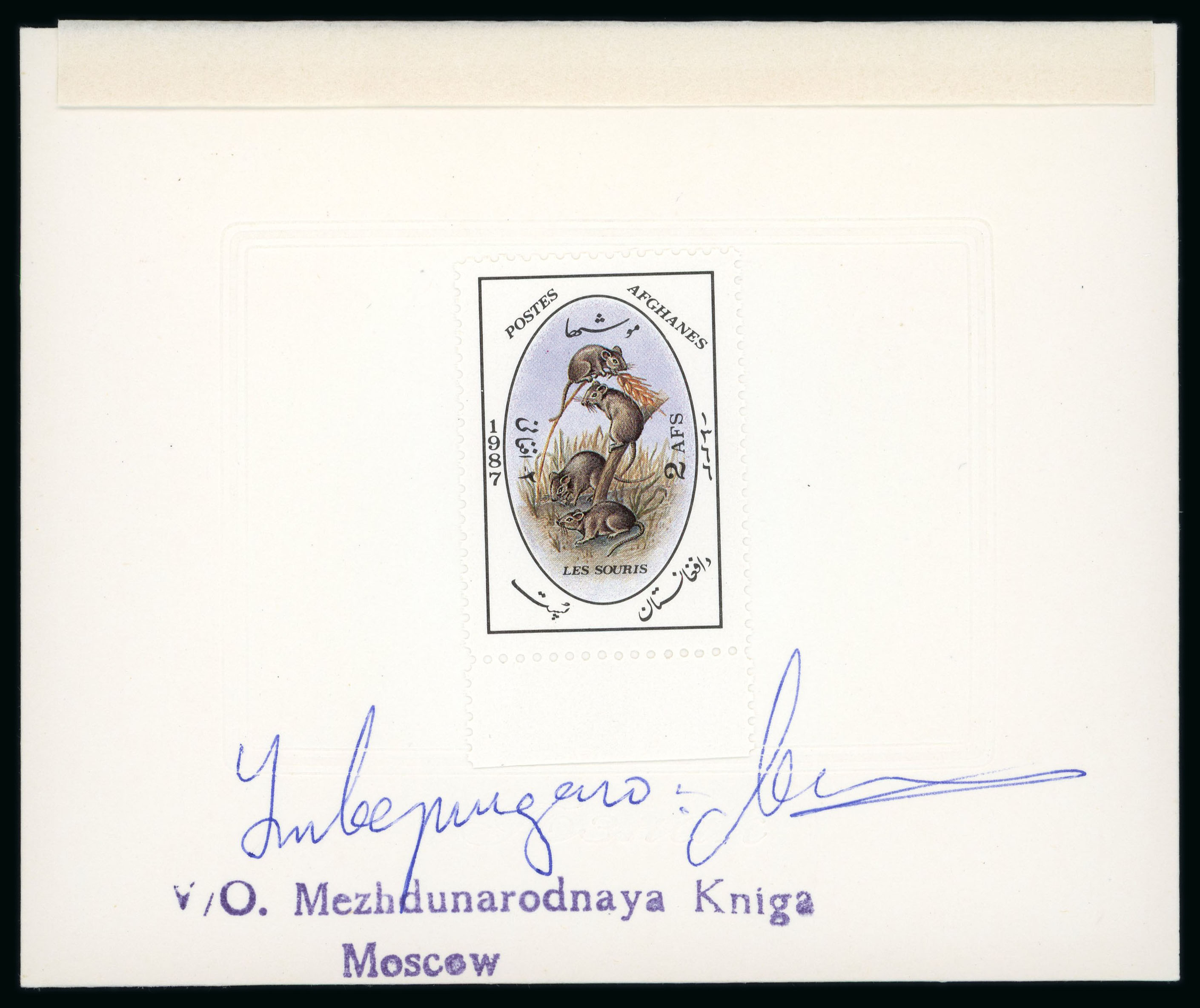 Afghanistan 1987 Mice set of five, each value a bottom marginal affixed to embossed framed card with signature and two-line Moscow printers handstamp (Image 1)