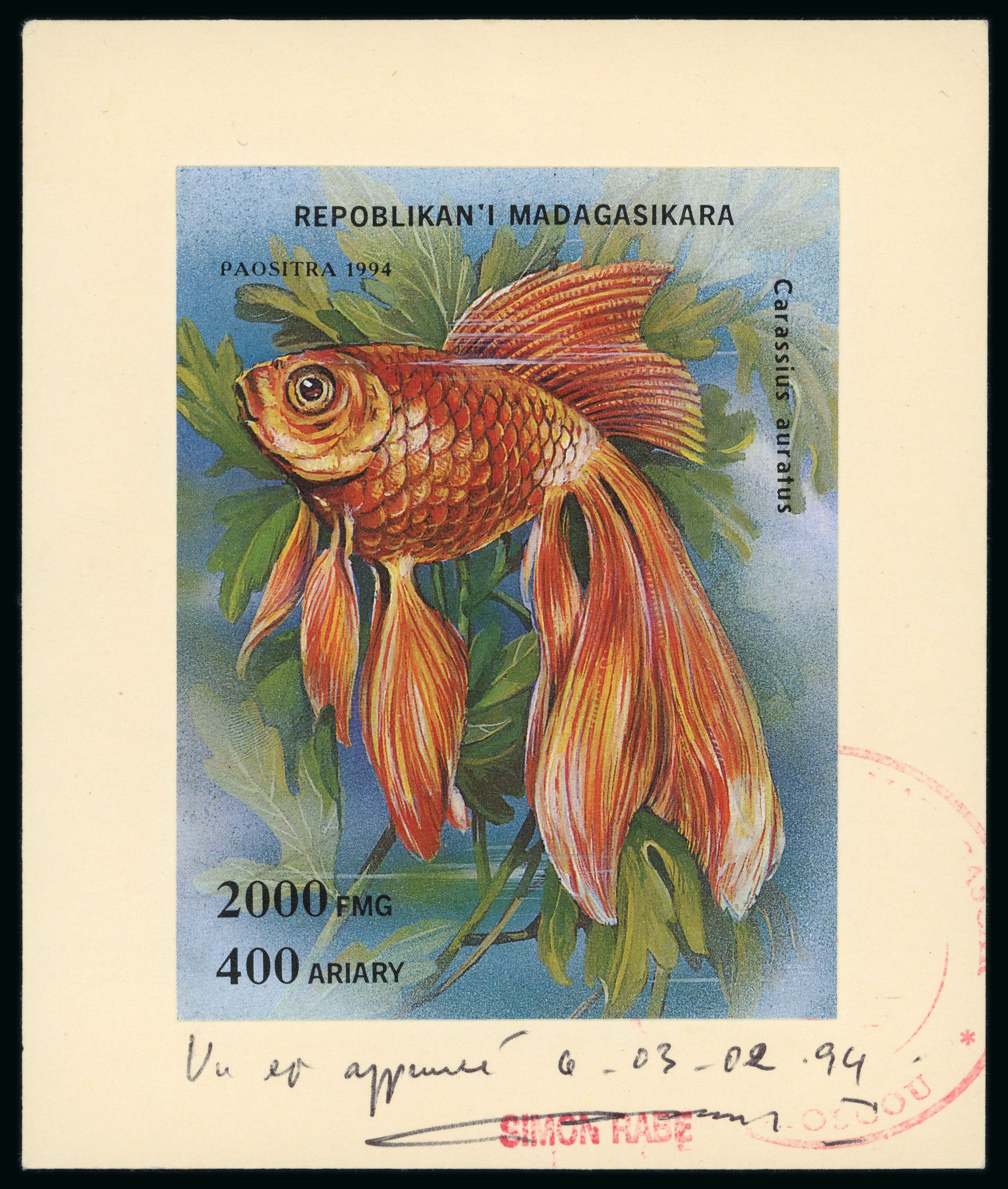 Madagascar 1994 2000f perf and imperf miniature sheets affixed to thin card with two-line manuscript at base and circular handstamp of printer tying the sheet, plus a loose miniature sheet never hinged, not issued (Image 1)