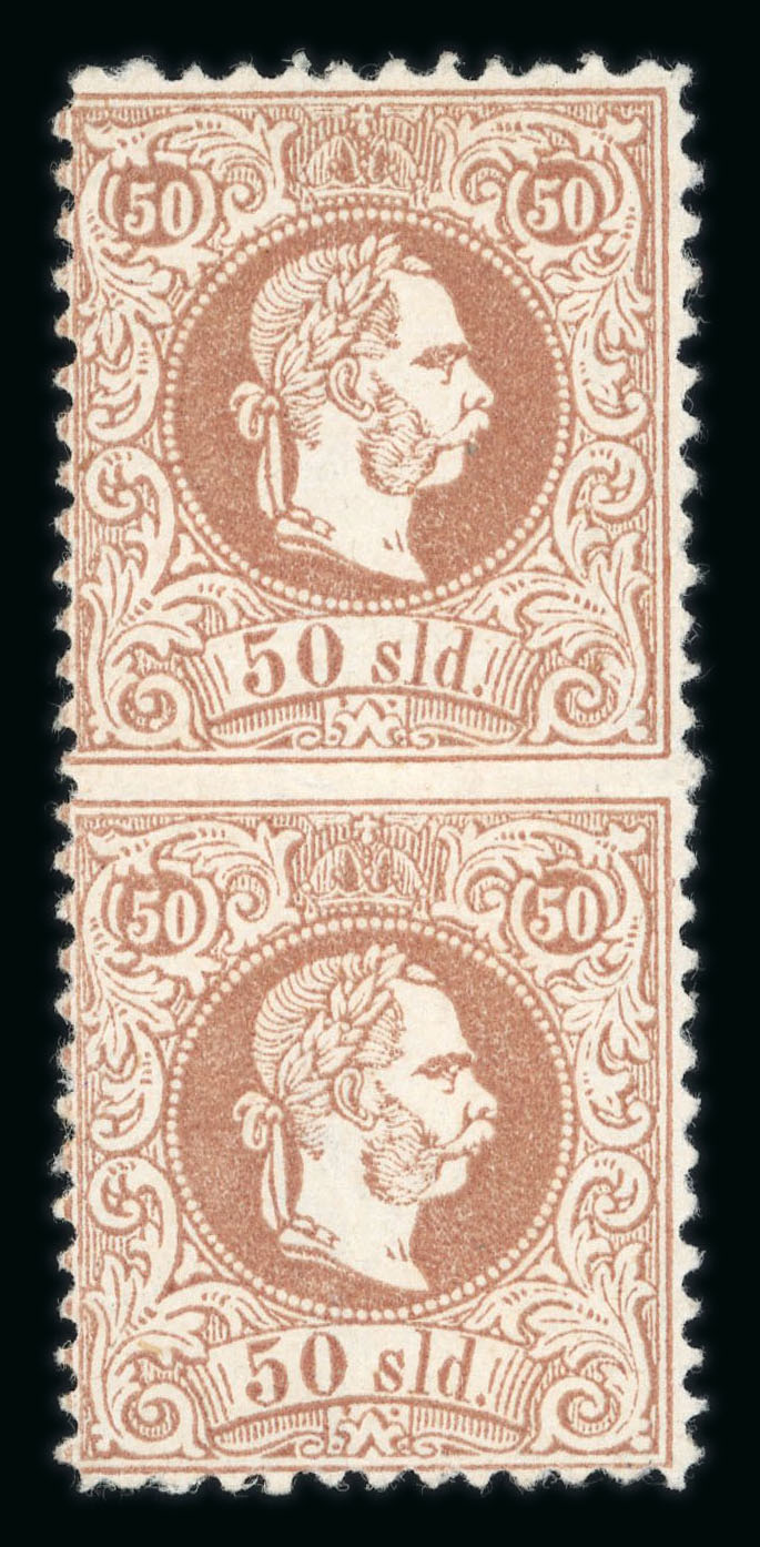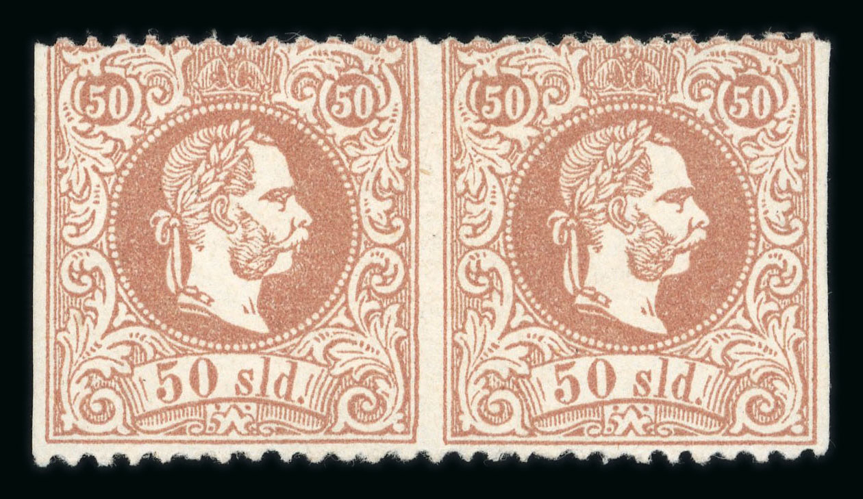 1867, waagerechtes Paar des 50 S - Höchstwertes MITTE UNGEZÄHNT, ungebraucht, echt und einwandfrei, Attest Ferchenbauer und Buder, ANK 7 I G, KW 450€. (Image 1)