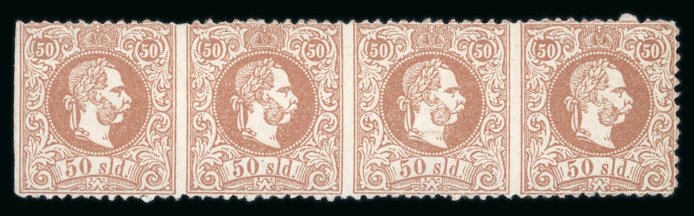1867, waagerechter Viererstreifen des 50 S - Höchstwertes MITTE UNGEZÄHNT, postfrisch, echt und einwandfrei, Attest Matl und Buder, ANK 7 I G. (Image