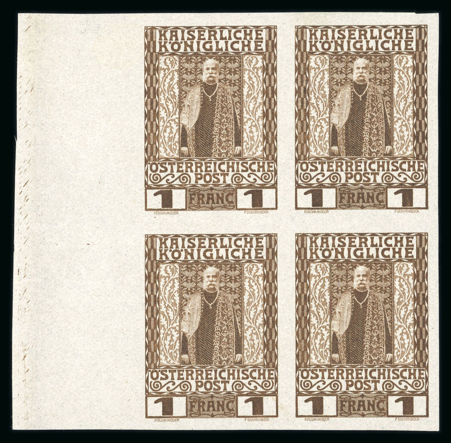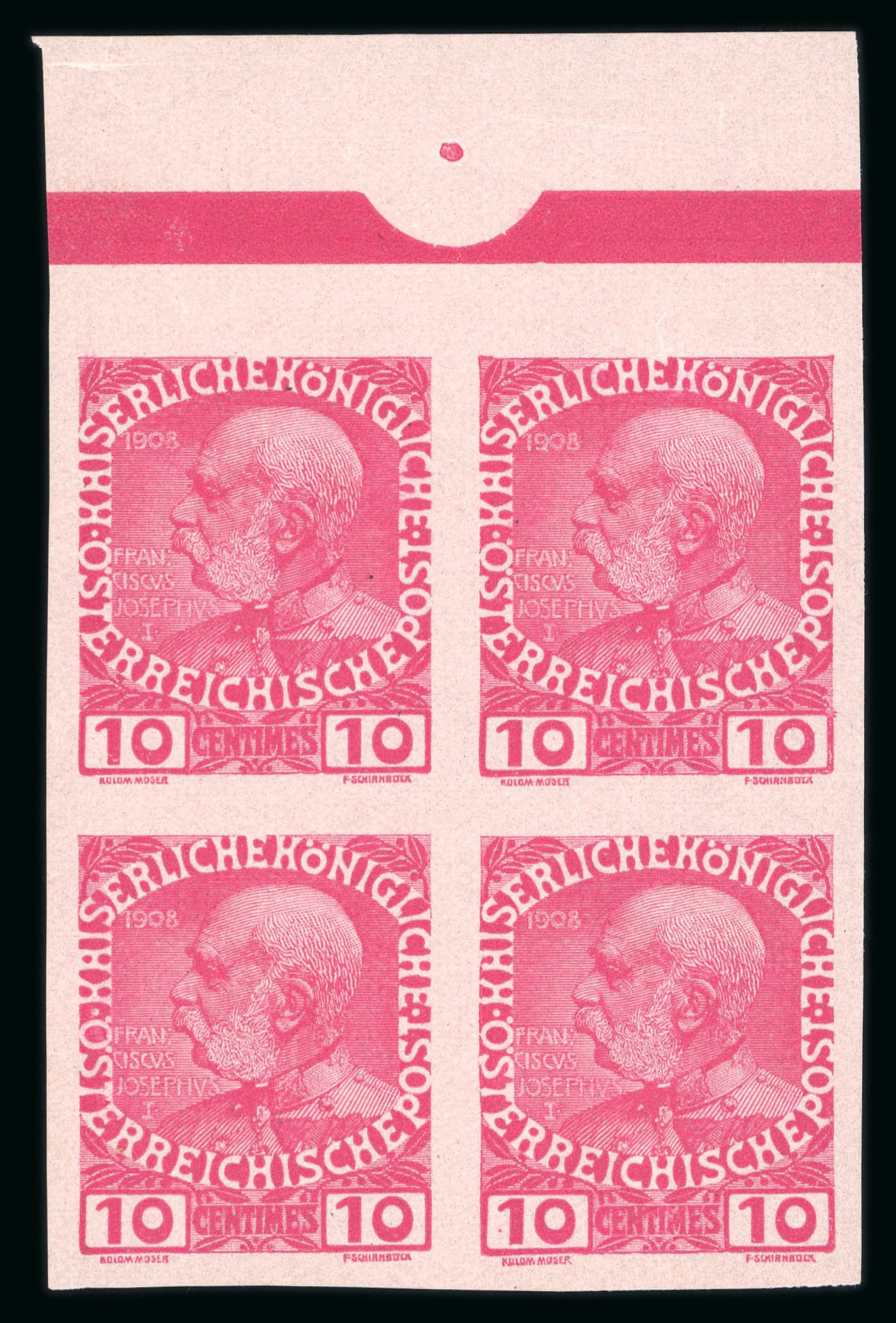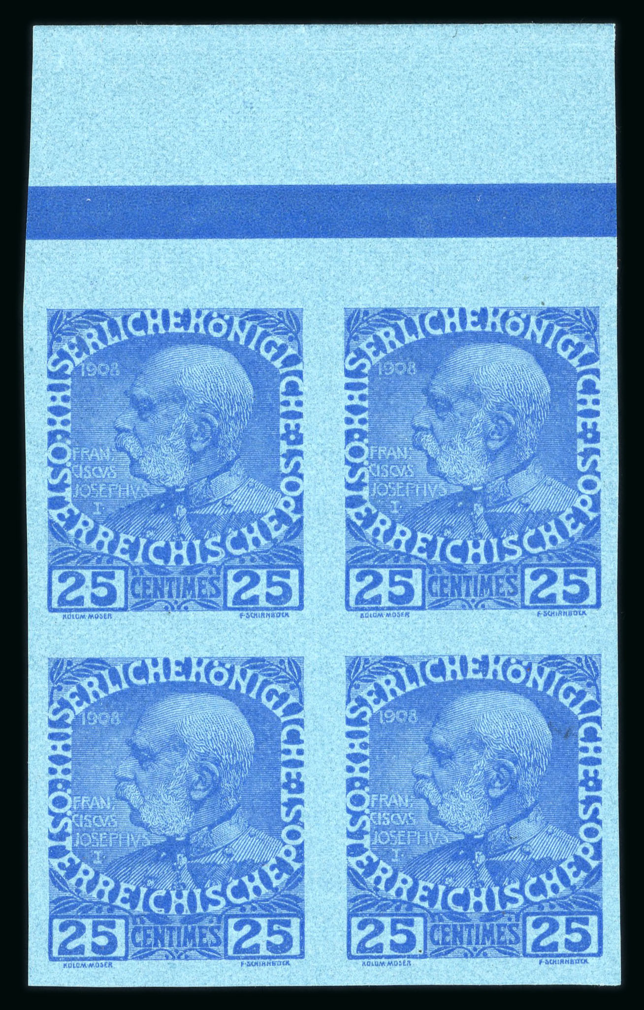 1908, Bogenproben / Vorzugsstücke der Jubiläumsausgabe, Viererblöcke vom Bogenrand, ohne Gummi wie hergestellt, Attest Buder, ANK 17 - 22 P III, KW 4000€. (Image 1)