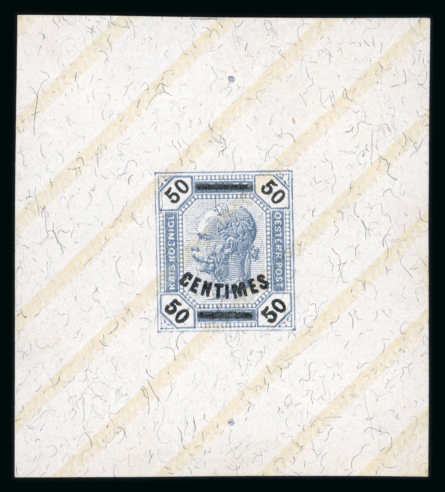 1903-04, Einzel-Aufdruckprobe der 50H - Marke mit Lackstreifen von links unten nach rechts oben, ohne Gummi wie hergestellt, Attest Buder, Befund Puschmann, ANK 4 P II, KW 400€. (Image 1)