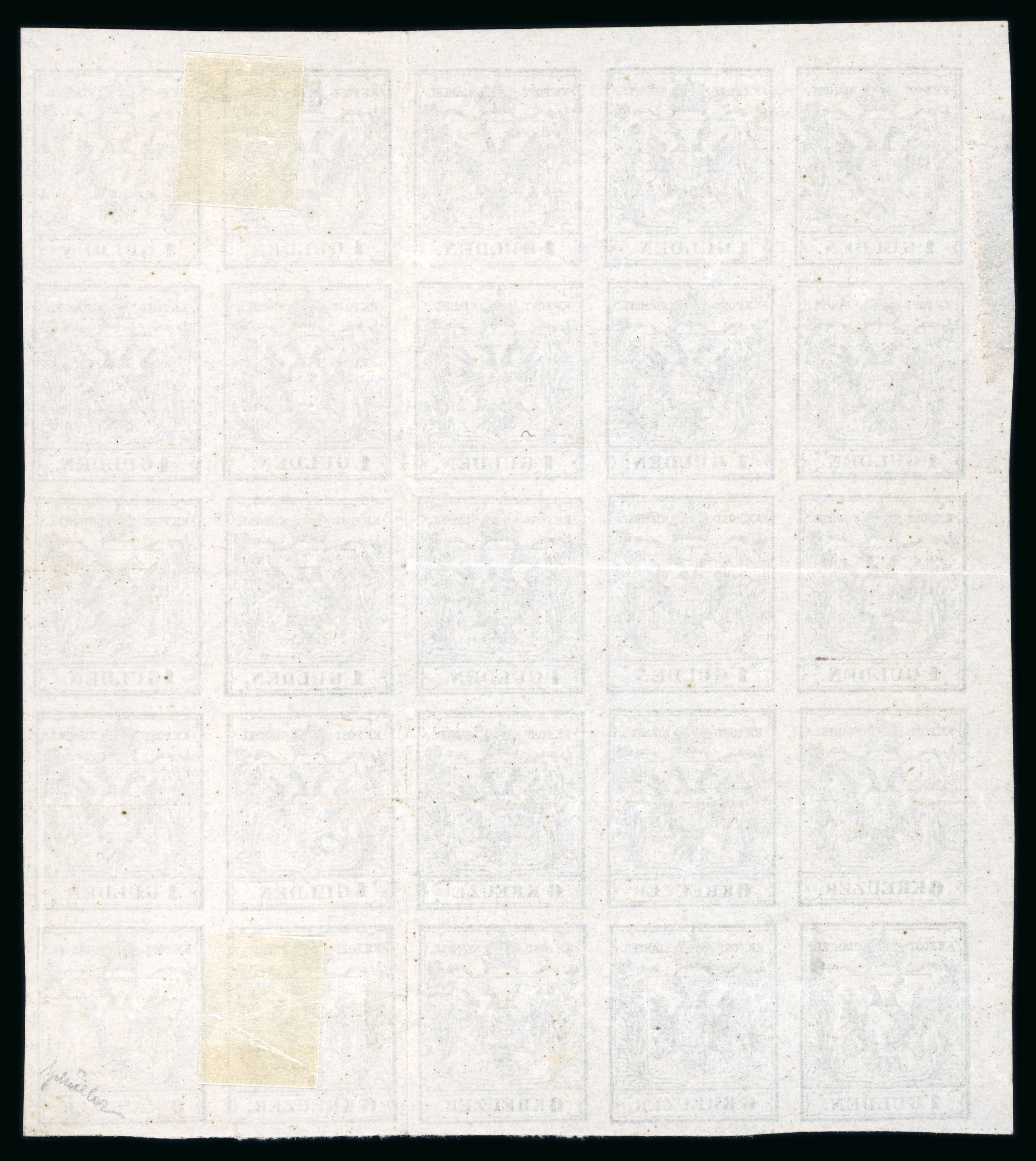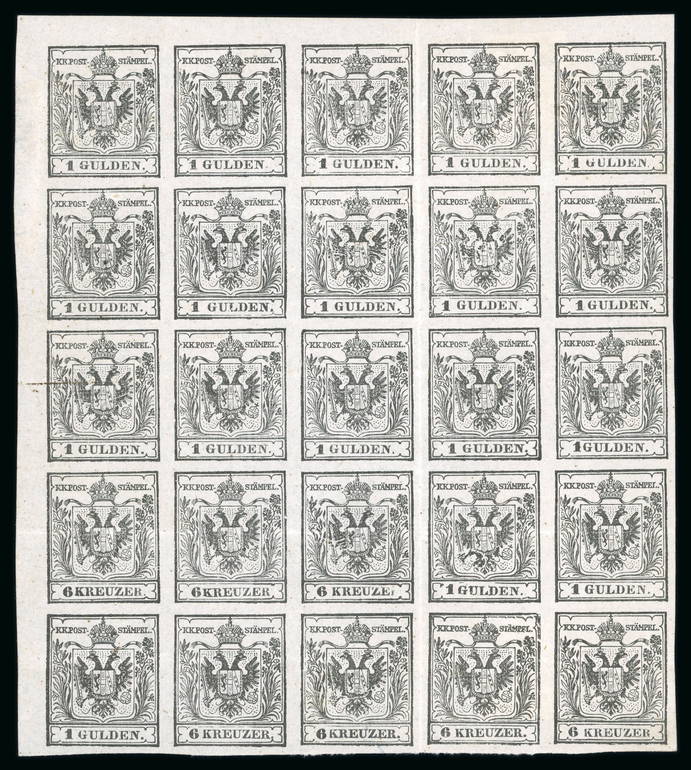 1850, Probedruck in 25er Bogenteil in besonders seltener Farbe schwarz der 1 Gulden mit insgesamt 5 se-tenant Paaren mit der 6 Kreuzer in noch nicht endgültiger Zeichnung (u.a. STÄMPEL statt STEMPEL) auf dünnem Papier.