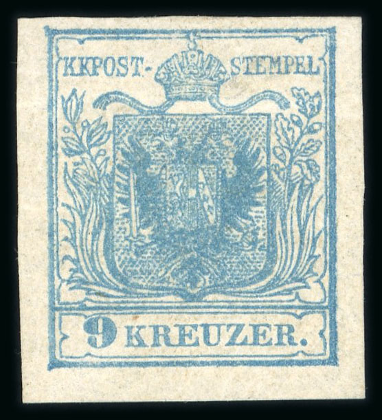 1850, 9Kr MP Ty III graublau, ungebraucht, allseits breitrandigst, minime Stockpünktchen, sign. Matl, mit Dorotheum Beschreibung Puschmann 'Kabinettstück', ANK €1300. (Image 1)
