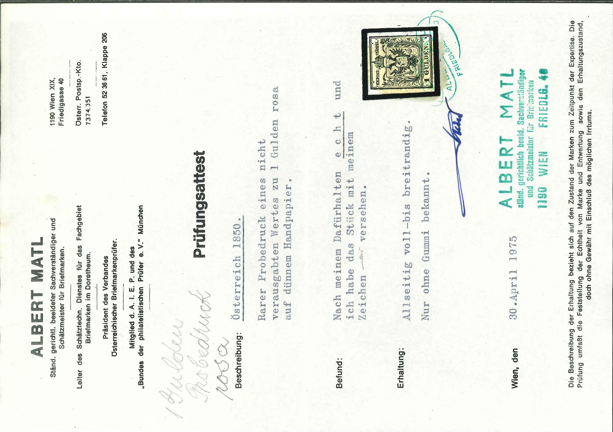 1850, Probedruck 1G trübrosa auf dünnem ungummiertem, immer mehr oder weniger bügigem Papier, allseits vollrandiges schönes Stk. und selten, Attest Matl, Ferchenbauer €1600. (Image 1)