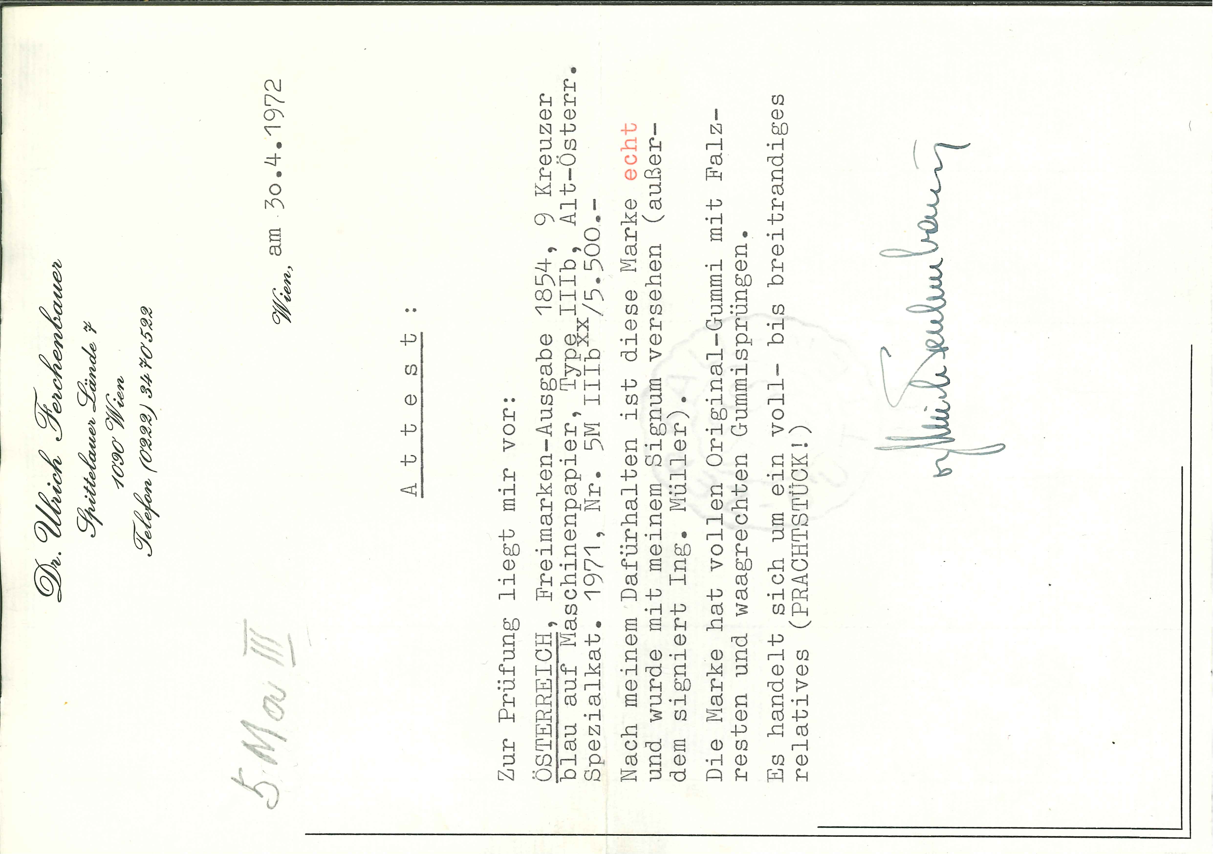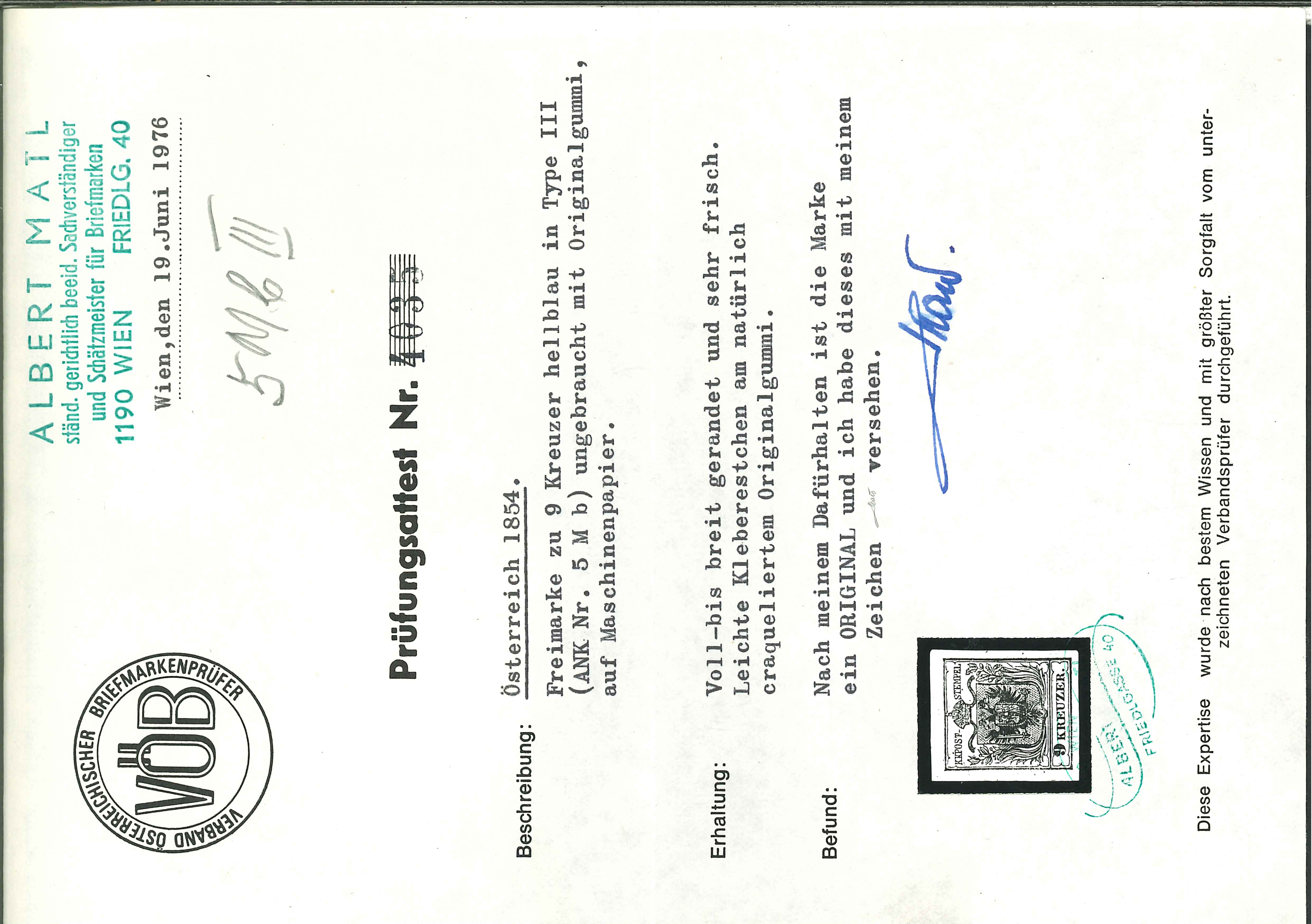 1850, 9Kr MP IIIb, blau, ungebraucht (mit typischen Gummisprüngen), sehr frisches und schönes Stück, sign. Ing. Müller und Ferchenbauer, Attest Ferchenbauer, ANK €1300. (Image 1)