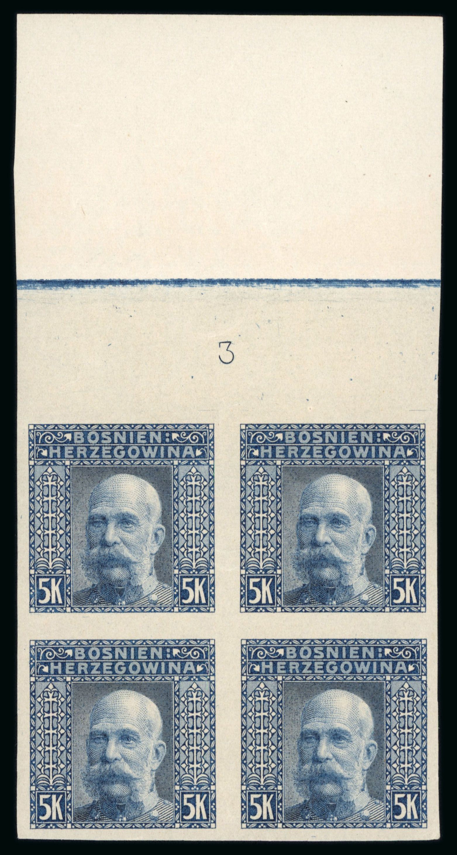 1906, Landschaftsbilder, 5 Oberrandviererblöcke und 2 Oberrandpaare der Kronenwerte mit PLATTENNUMMERN, insgesamt 7 dekorative Einheiten, meist postfrisch, ANK 42-44. (Image 1)