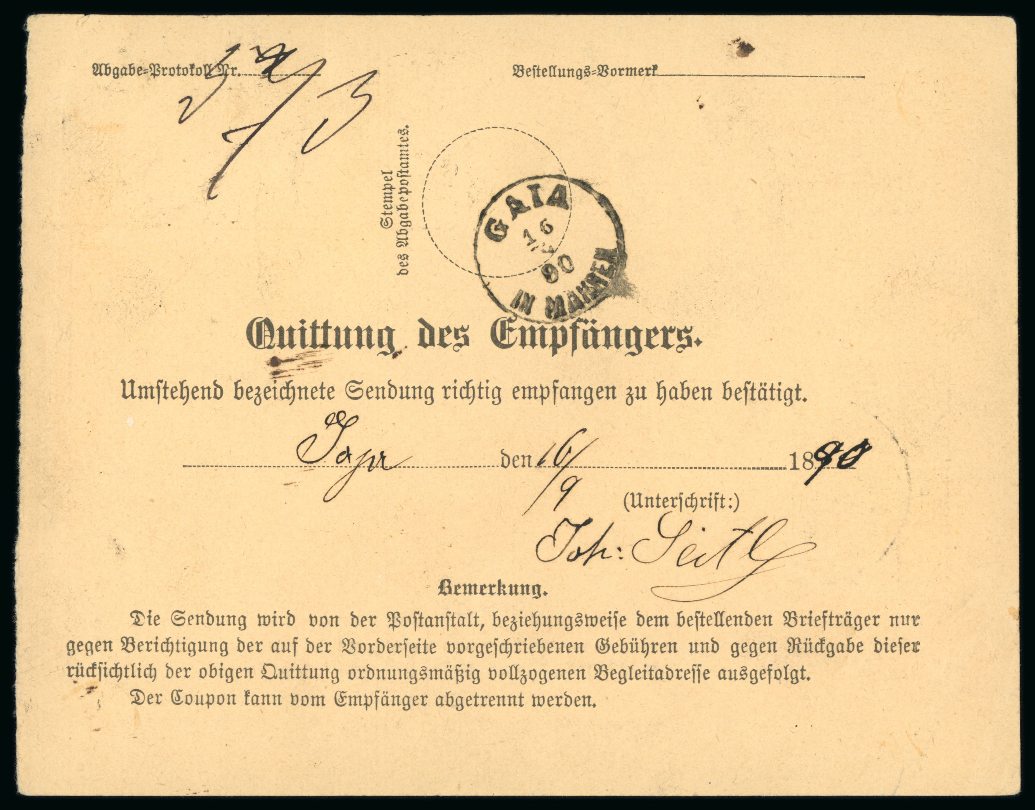 1883-90, Inlandspaket Begleitkarte fkd 1883 50Kr bräunlich lila + 10Kr + 1890 12Kr pmk WIEDEN WIEN 15.9.90 nach Gaia in Mähren, selten. (Image 1)