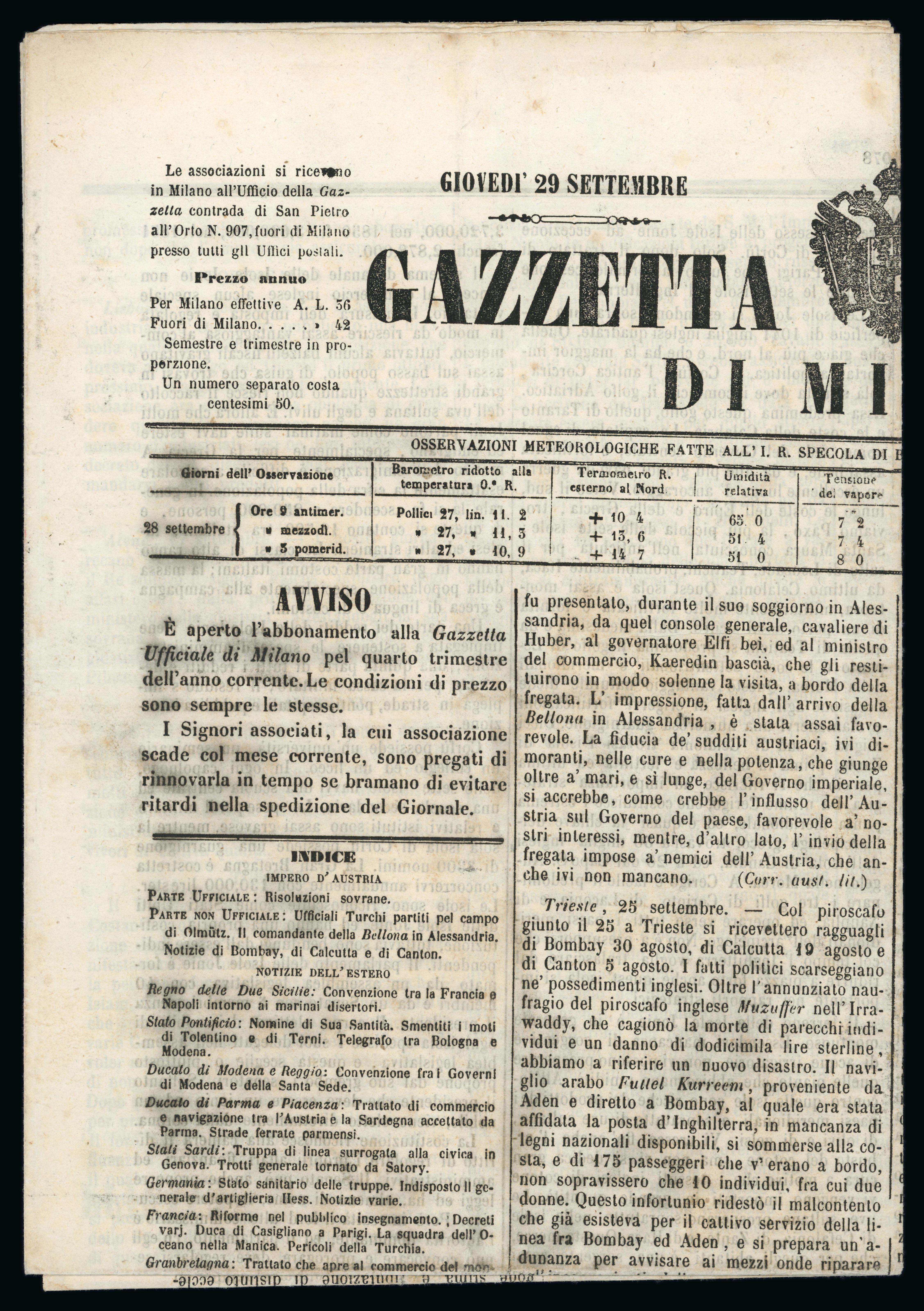1851 0,6 kr, Blauer Merkur, Typ IIc, auf kompletter Zeitung Gazzetta Ufficiale Milano 29 Sep 1853, verwendet in Lombardei-Venetien, gestempelt Lodi 30 Sep, sehr frisch, mit klarem bis sehr breitem Rand (mit Teil der angrenzenden Marke