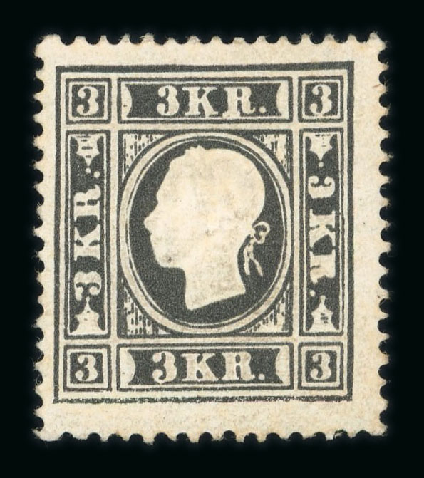 1858 3Kr schwarz, Ty Iax (beide R normal) ungebraucht mit kaum sichtbaren Falzspuren (Gummi etwas verbessert), leichte Patina, farbfrisches, sehr schönes und sehr seltenes Stück, Attest Matl (welcher von Prachterh. spricht), ANK 11Iax,