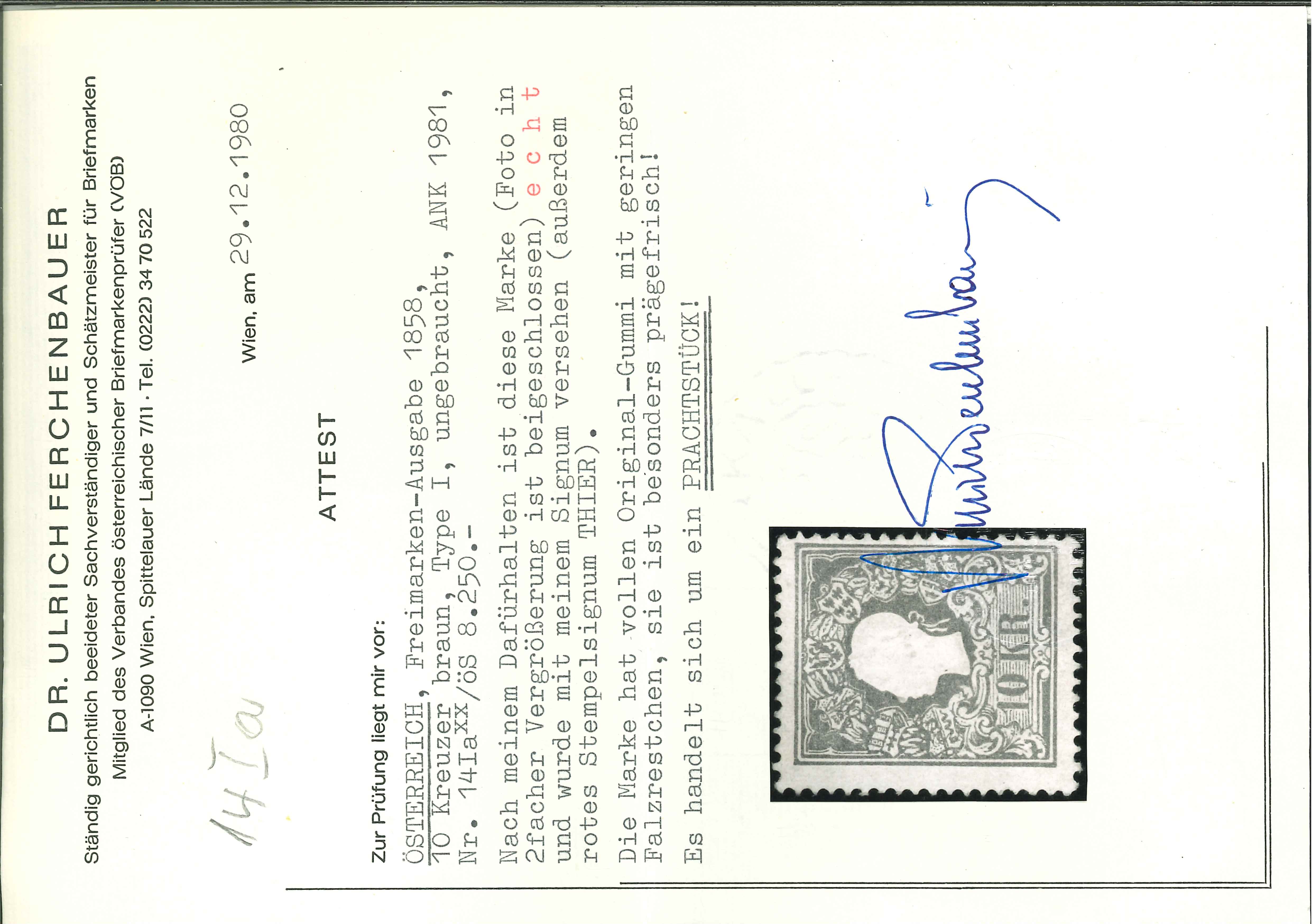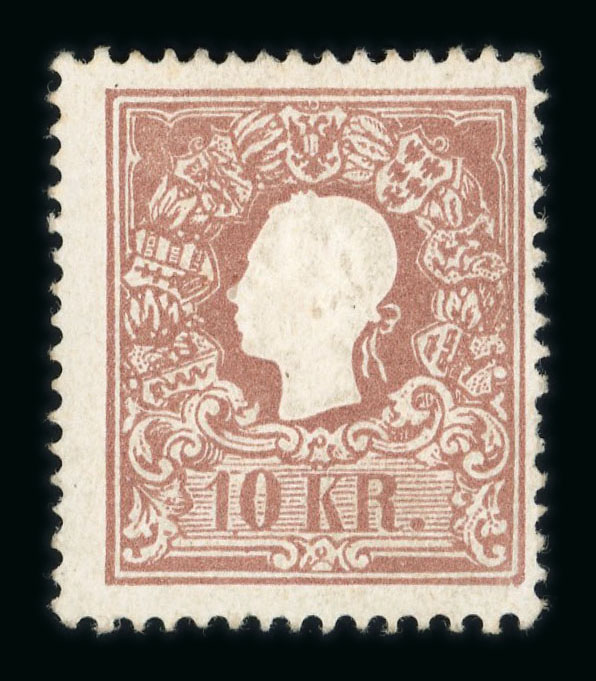 1858 10Kr braun, Ty Ia ungebraucht, farbfrisches Prachtstück, Altsignum Thier sowie Ferchenbauer, Attest Ferchenbauer, ANK 14Ia €3800. (Image 1)