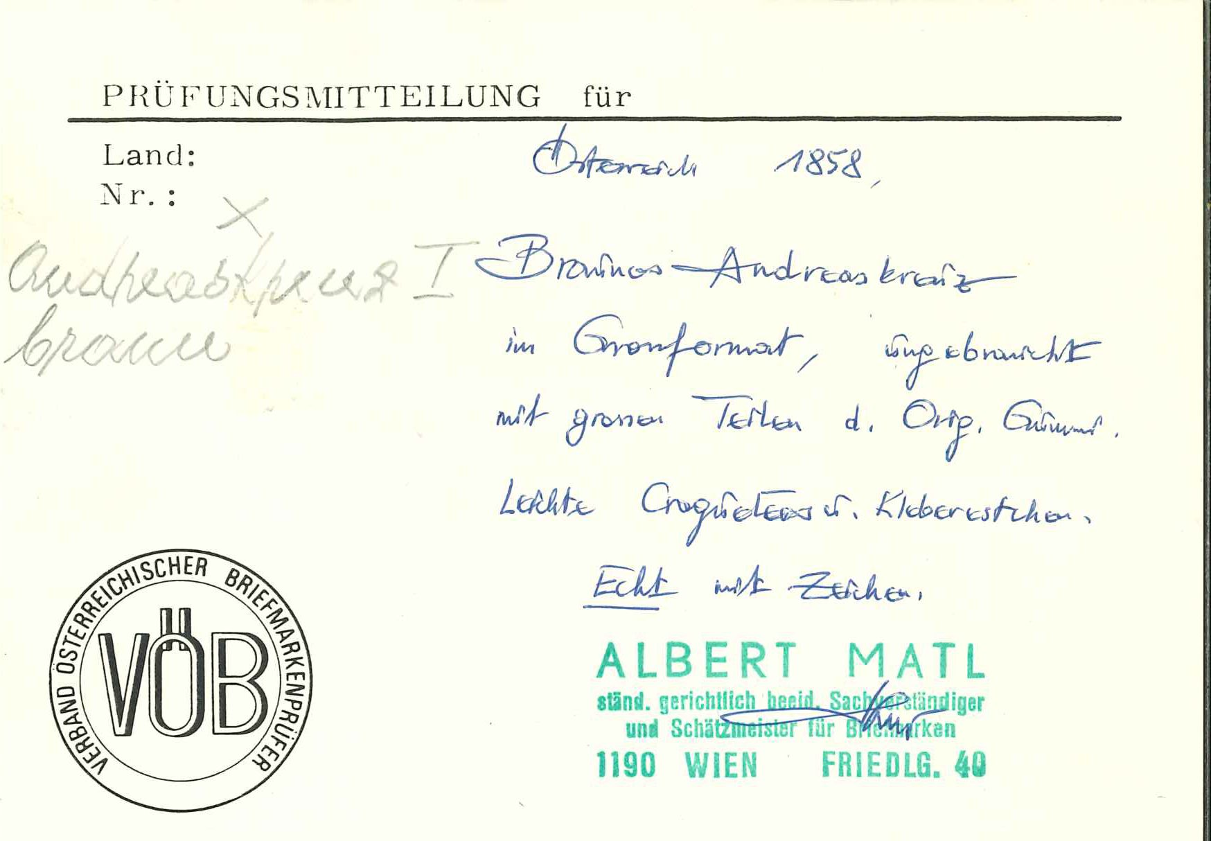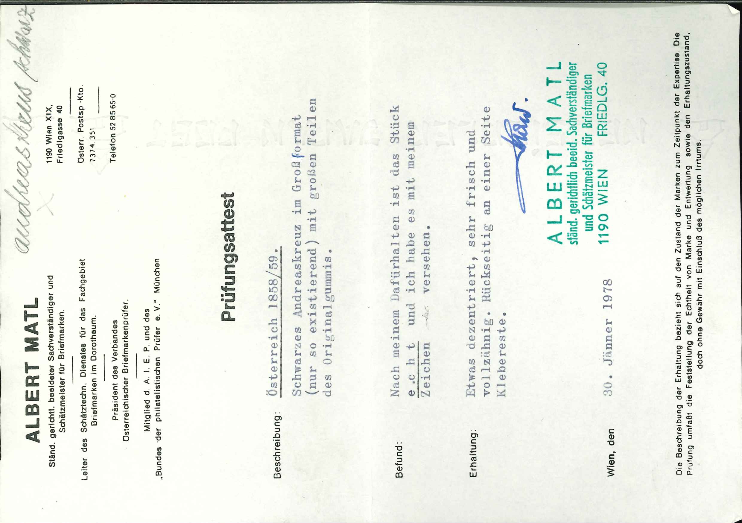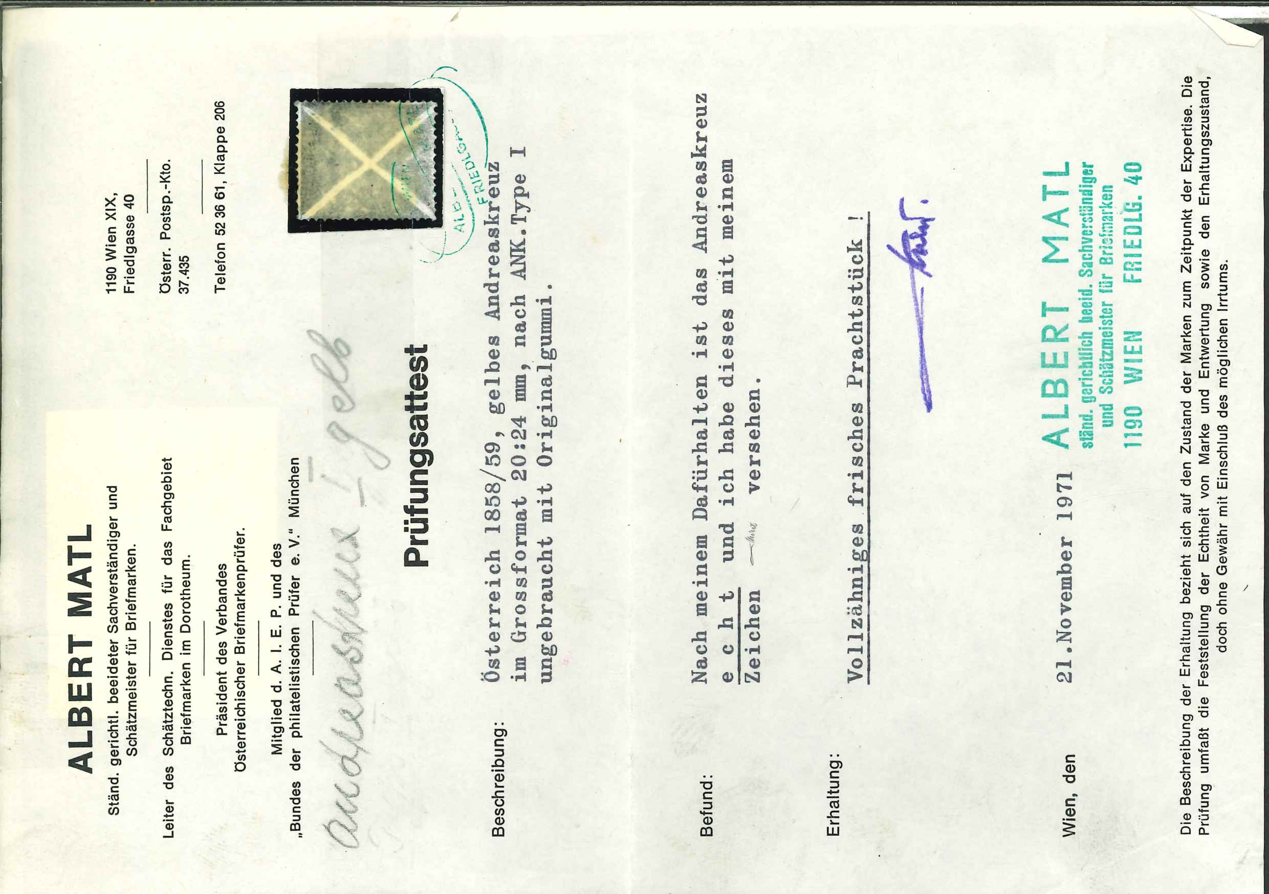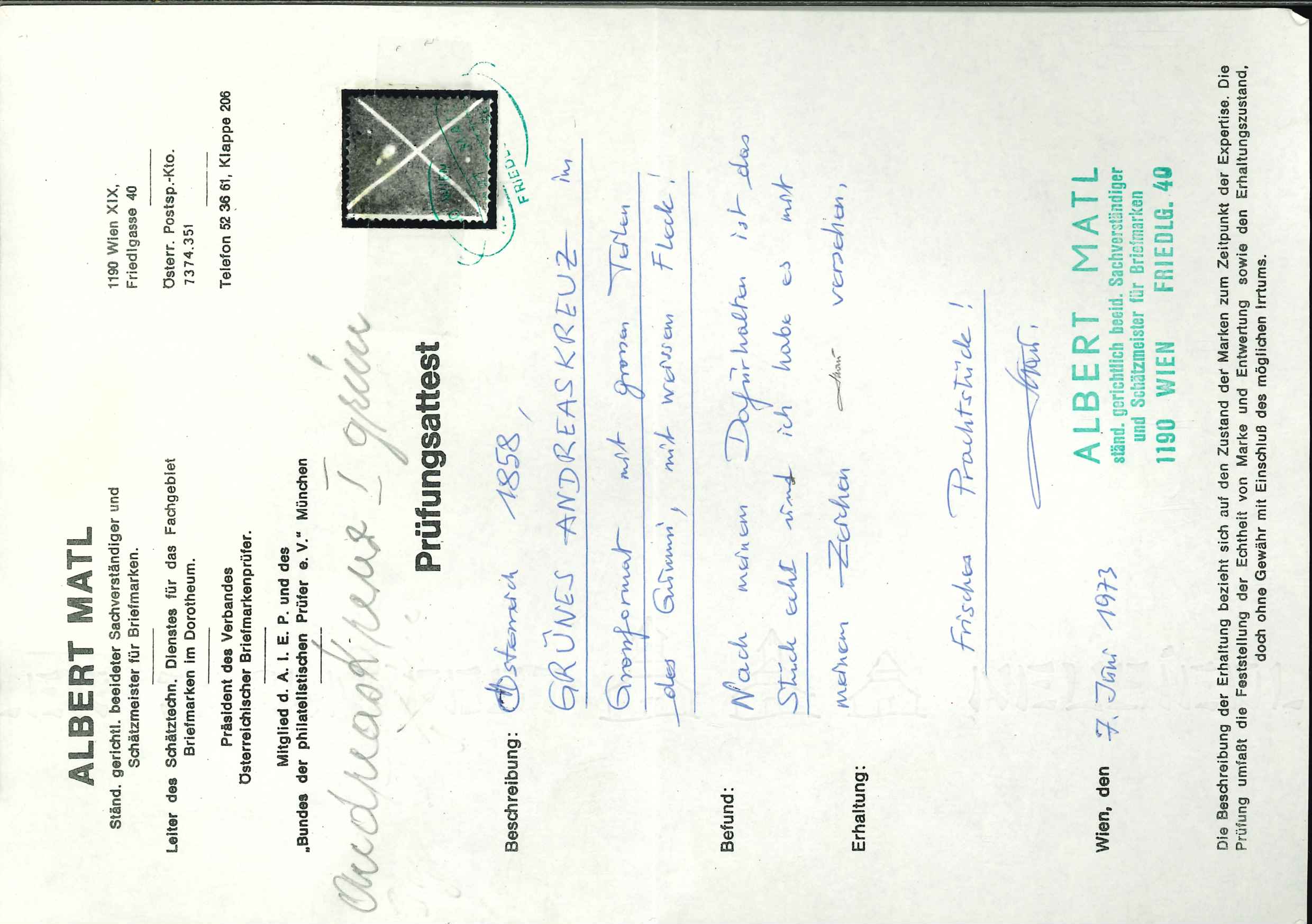 Attest Matl (1975): "auf dünnen Papier mit Teilen des Originalgummi...eines der schönsten existierenden Ungebrauchtstücke. Frisches Stück von deutlicher Farbe !", neuestes Attest Mag. Winter (Image 1)
