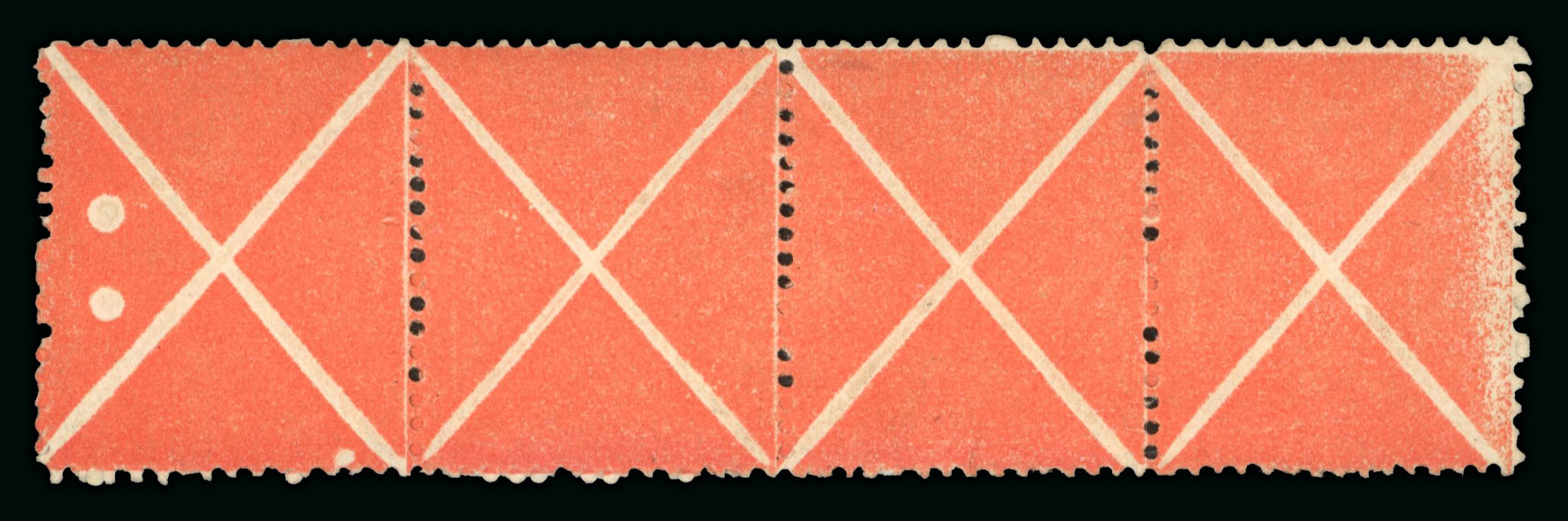 1858, Roter Andreaskreuz 4er-Streifen, Type I, ungebraucht, Zahnbrücken ausnahmsweise noch intakt, links 2 grosse Plattenpunkte, sehr farbfrisches Stück in nahezu Prachterhaltung, mit Befund Ferchenbauer, ANK €800. (Image 1)