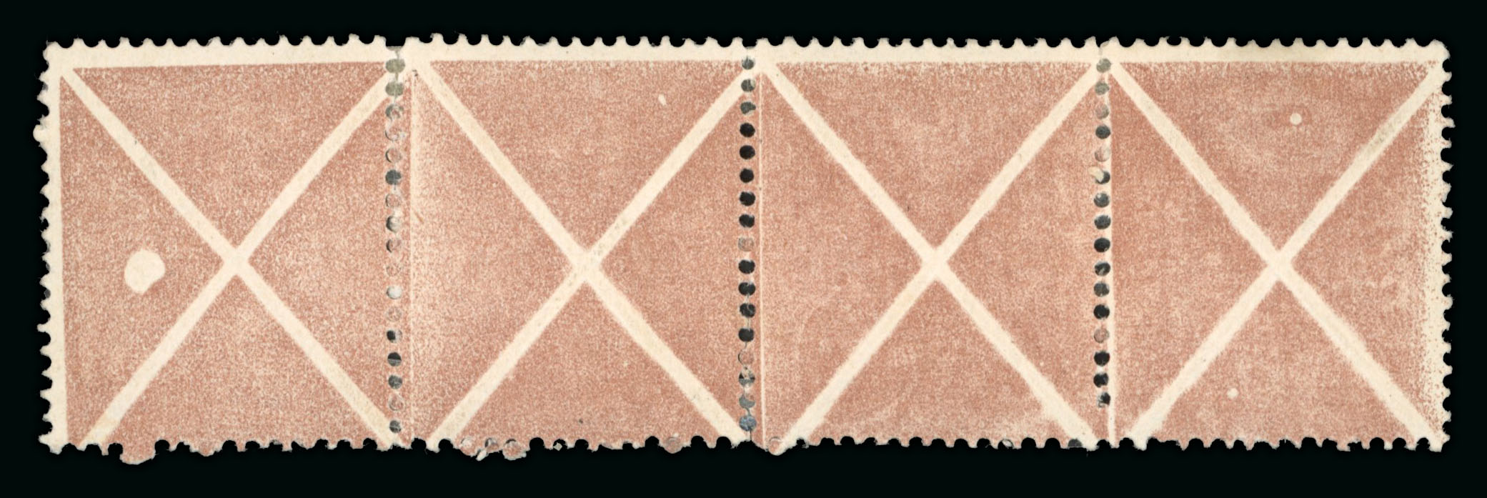 1858, Brauner Andreaskreuz 4er Streifen, Type I, ungebraucht mit den üblichen Stützungen in der tls. leicht angetrennten Zähnung, links 1 grosser Plattenpunkt, sehr farbfrisches Stück, Prachterhaltung, selten in dieser guten Erh., Attest