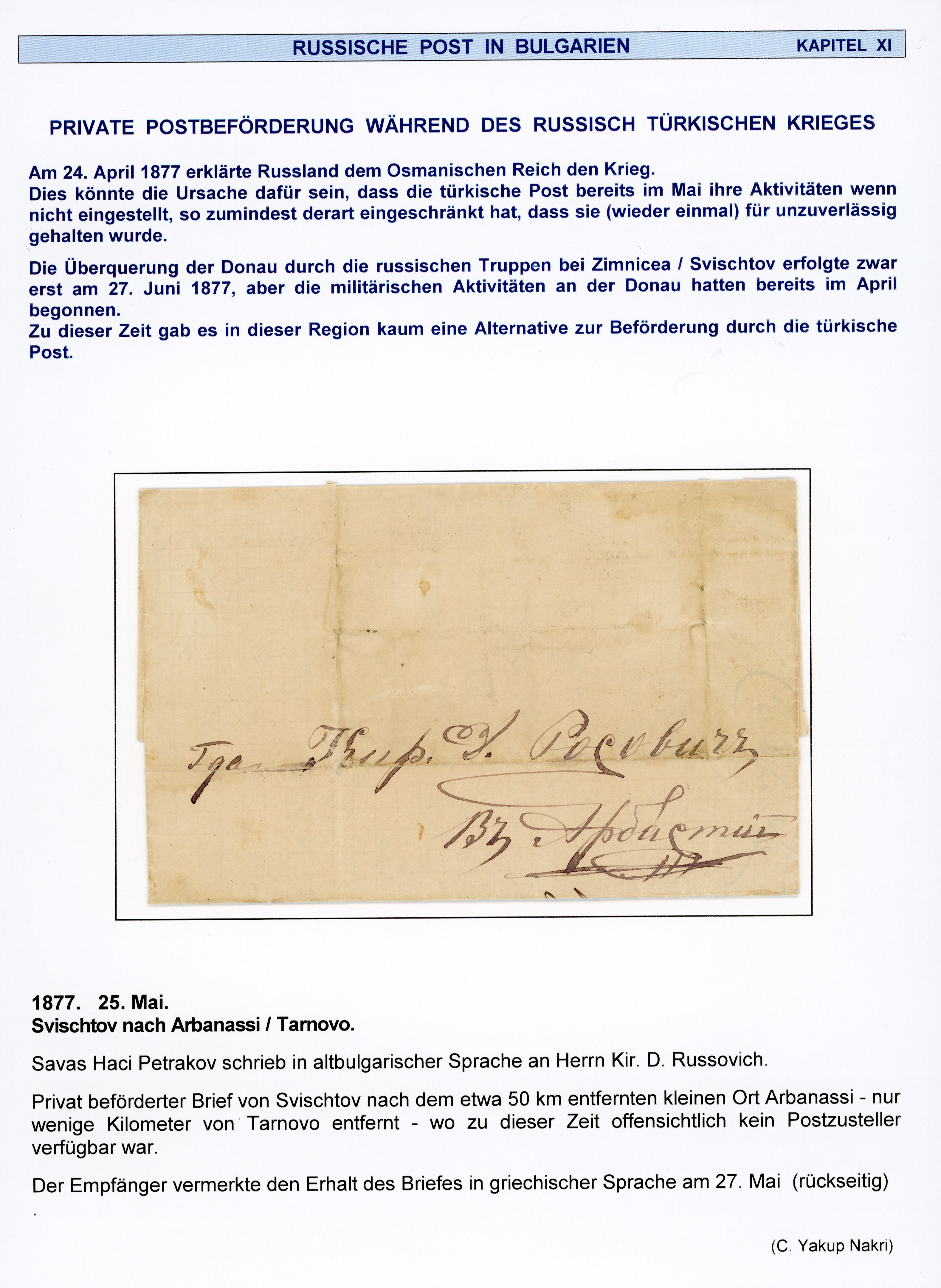 1877 Folded letter from Arbanassi/Tarnovo to Svischtov in lack of official mail service, dated inside 25.5.77, with 1 page + contents, receipt annotation inside 27.5, cert. Nakri. (Image 1)