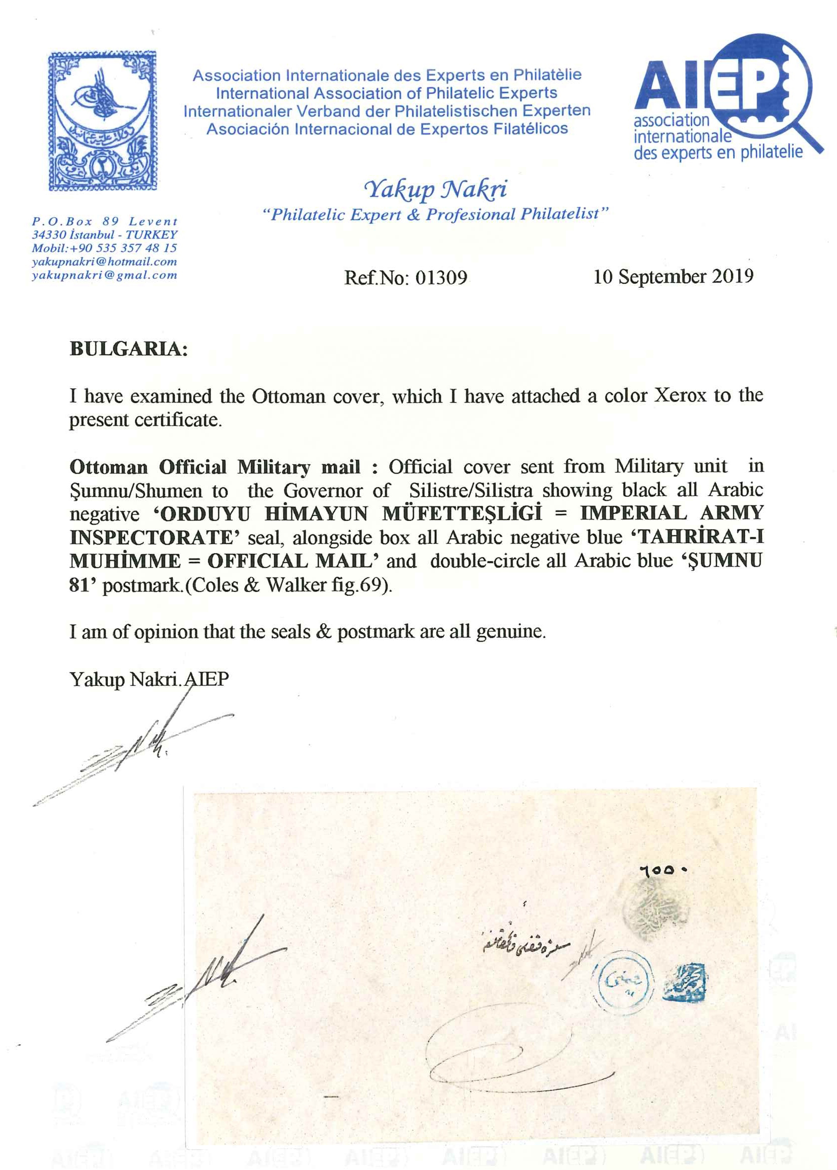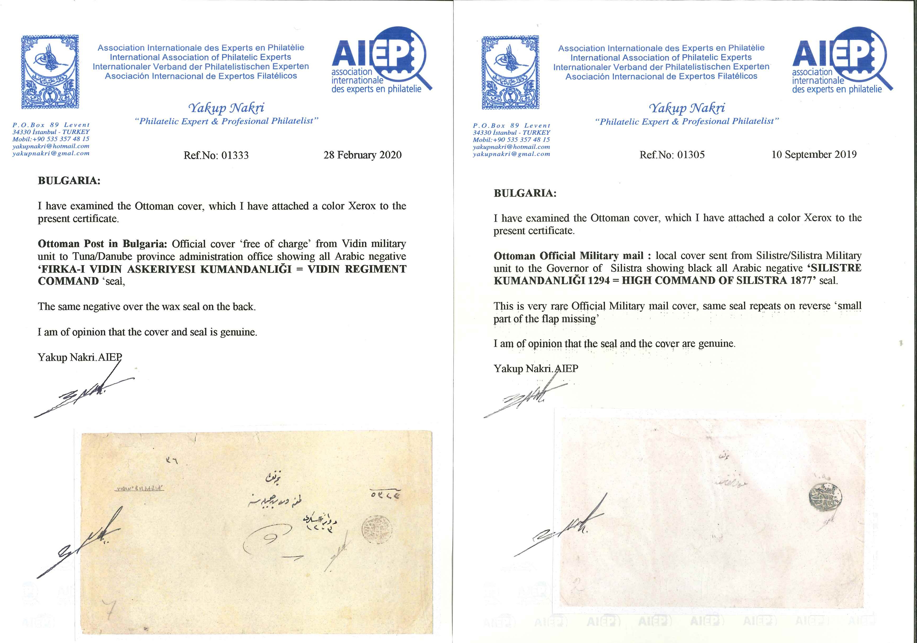 1865-77, Official Turkish Military Mail: 3 Covers from Schumen, Silistra (extremely scarce 'High Command of Silistra 1877') and from Vidin (to Roustchouk), a very rare trio, all certs Dr.Nakry (Image 1)