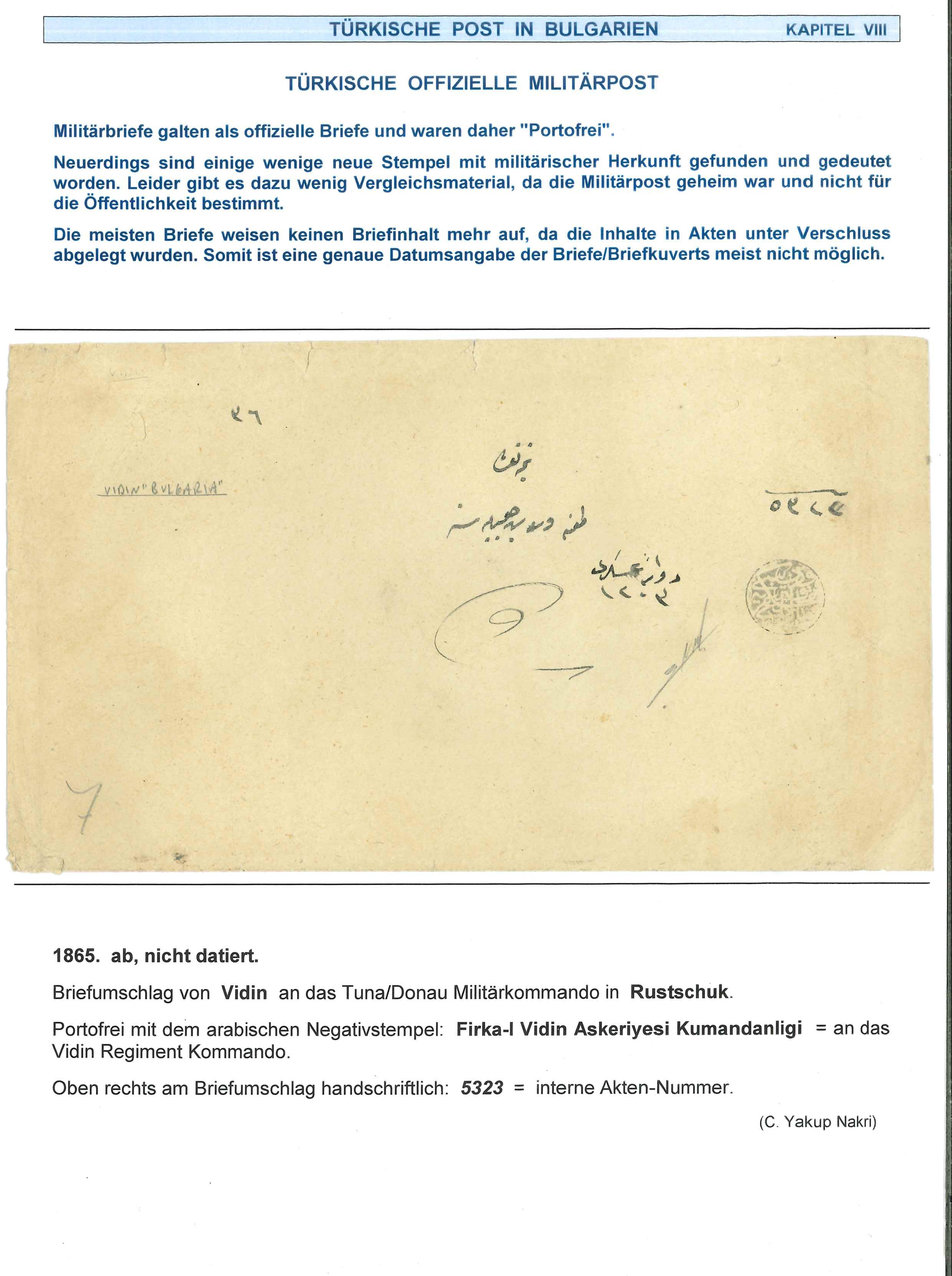 1855ca. Turkish official mail in Bulgaria, four letters on three exhibit pages with very valuable analysis. Official letter Rustschuk to Governor of Vidin with the required official handstamps. Sumnu-Constantinople with small