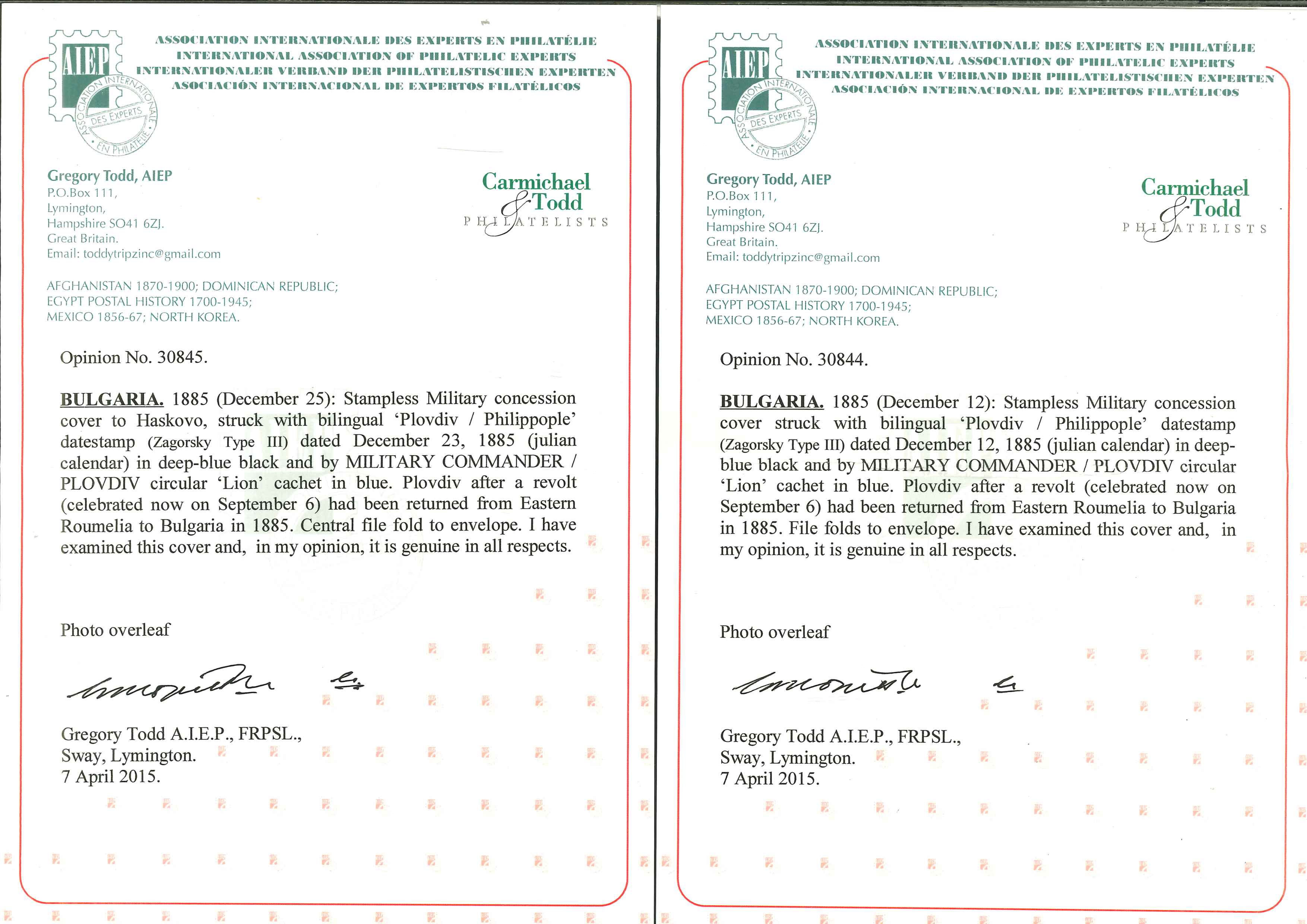1885, Envelopes (2) after reunion with Bulgaria showing in blue the lion seal + Philipopple 12.12.85 and 25.12.85 cds to Rachovo, these 2 envelopes with their lion cachet of MILITARY COMMANDER PLOVDIV are sort of cto markings nevertheless