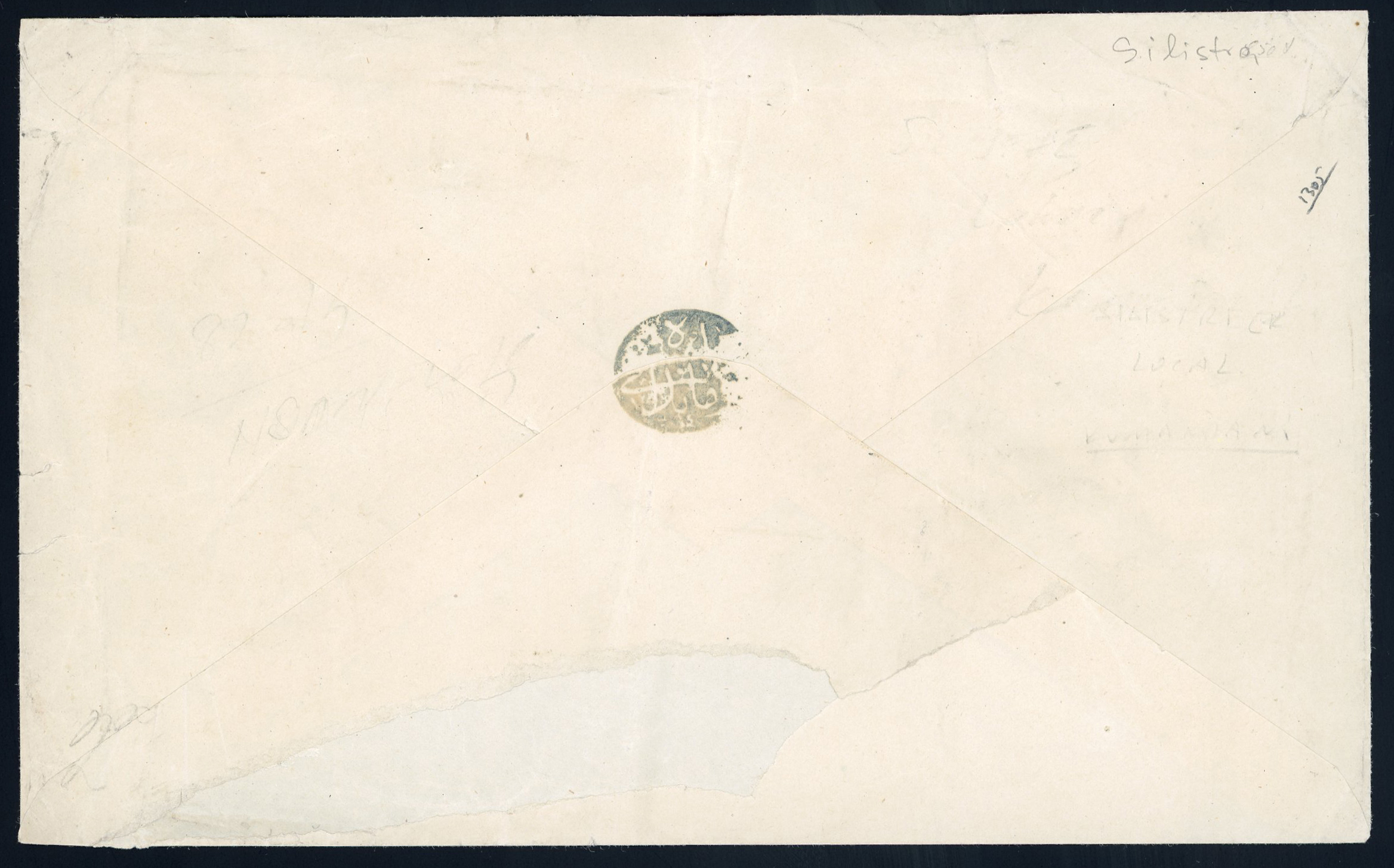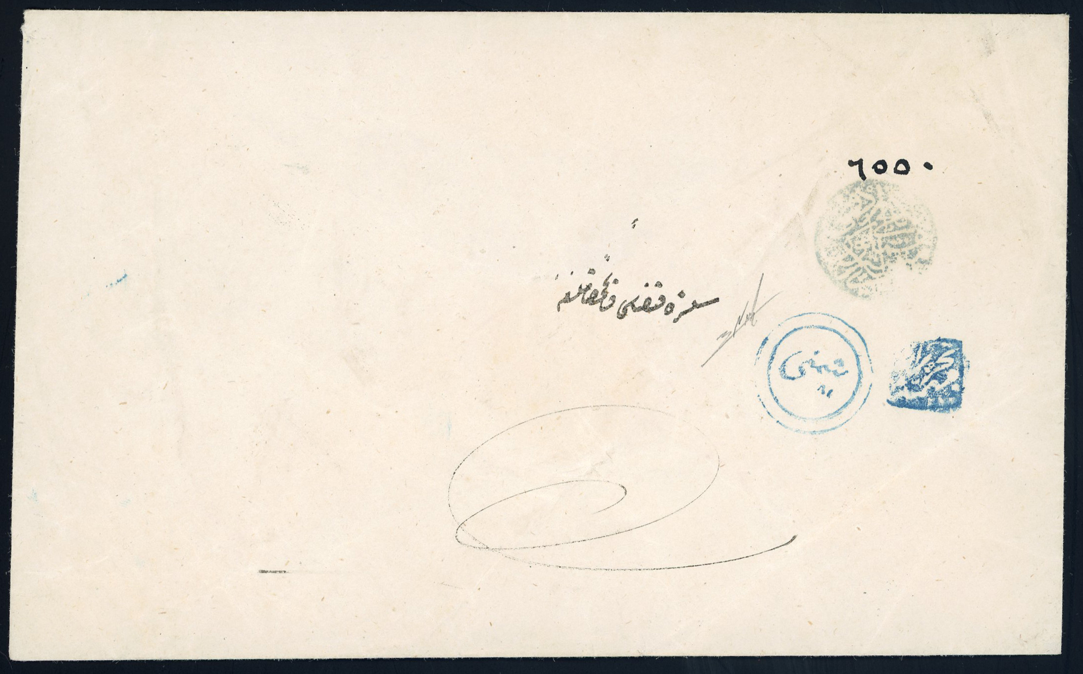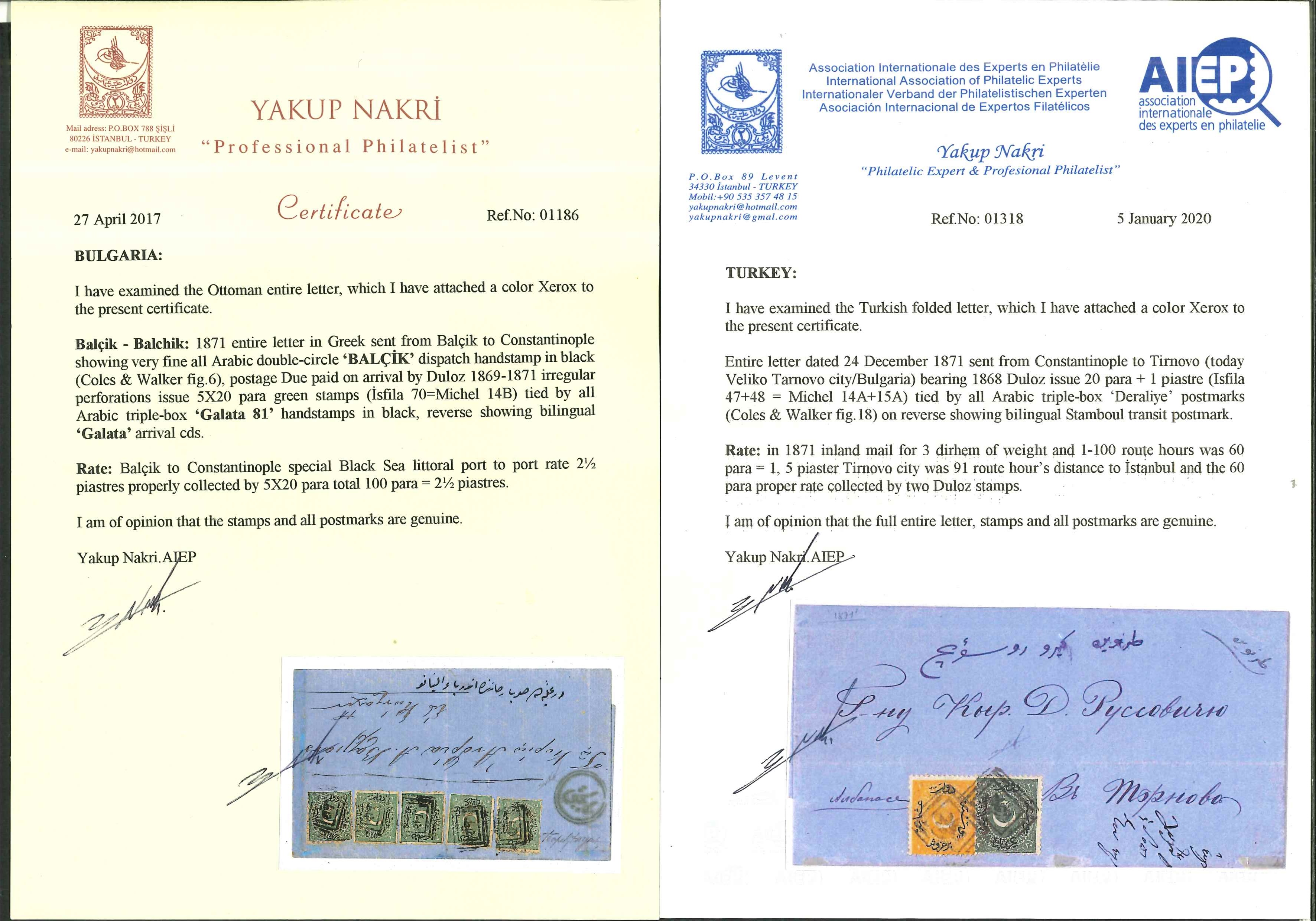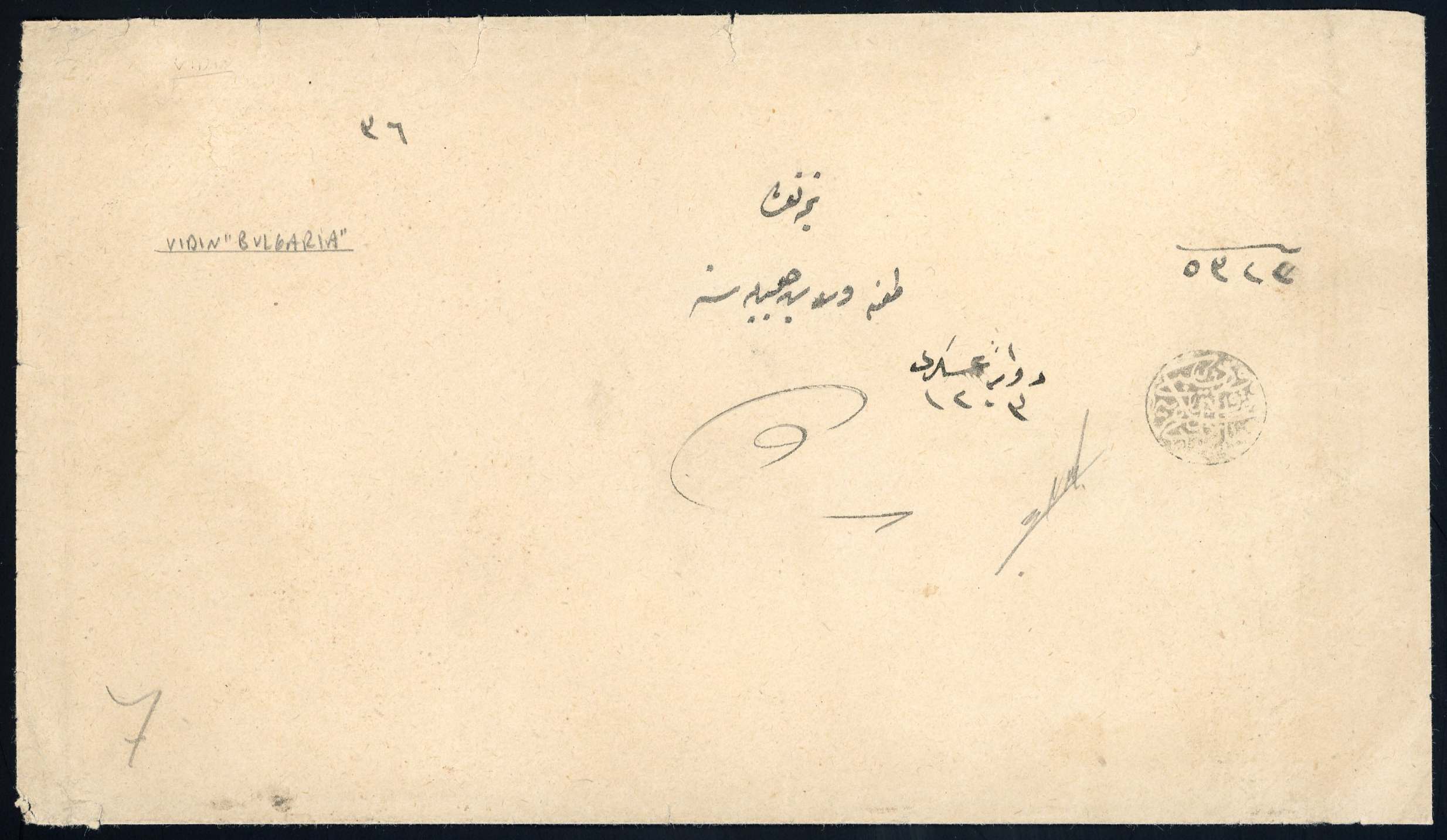 and cancelled in Galata with 5 due 20p for sea/land route via Varna; 1876 Filibe-Contantinople bearing 20p, 1pi , on reverse 1pi overprinted for city delivery fee. Also 1884 Constantinople-Tatar-Pazardijk bearing bisect 20p, tied by Stamboul Depart