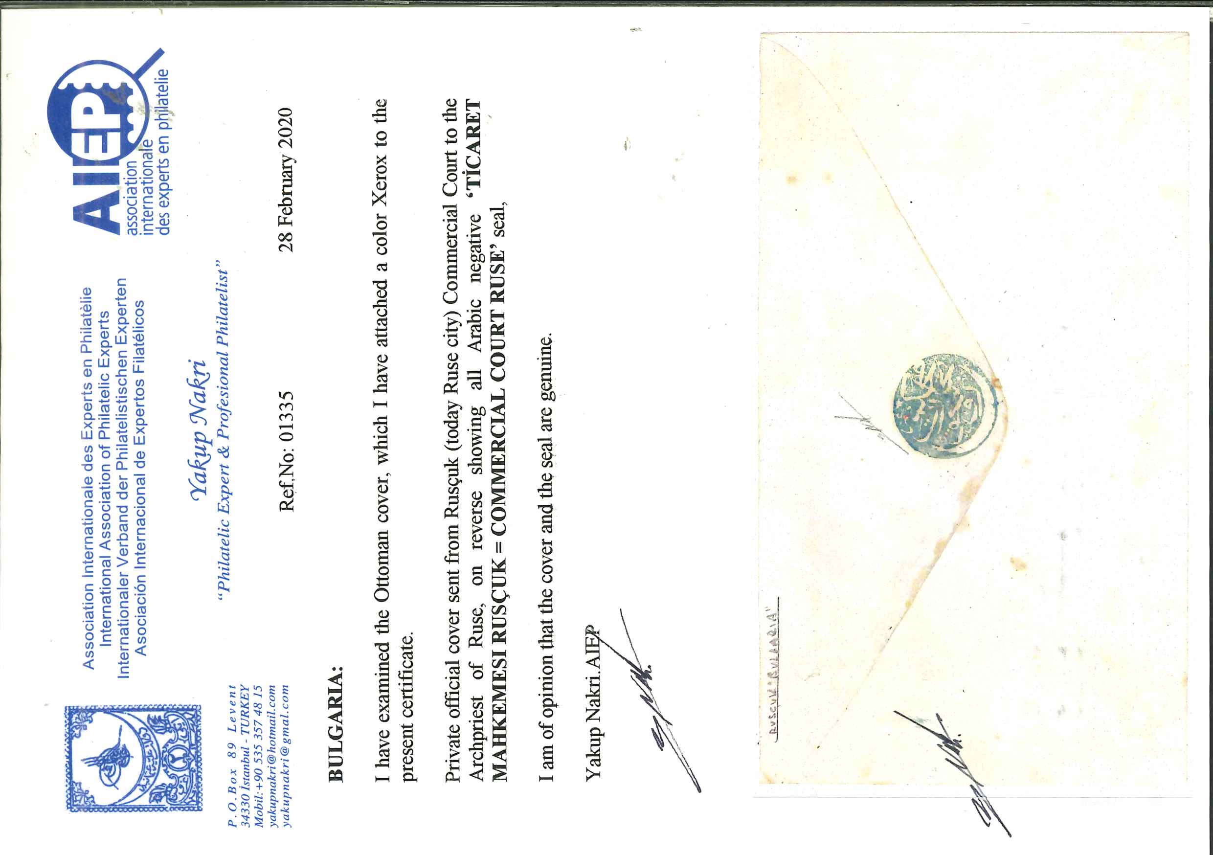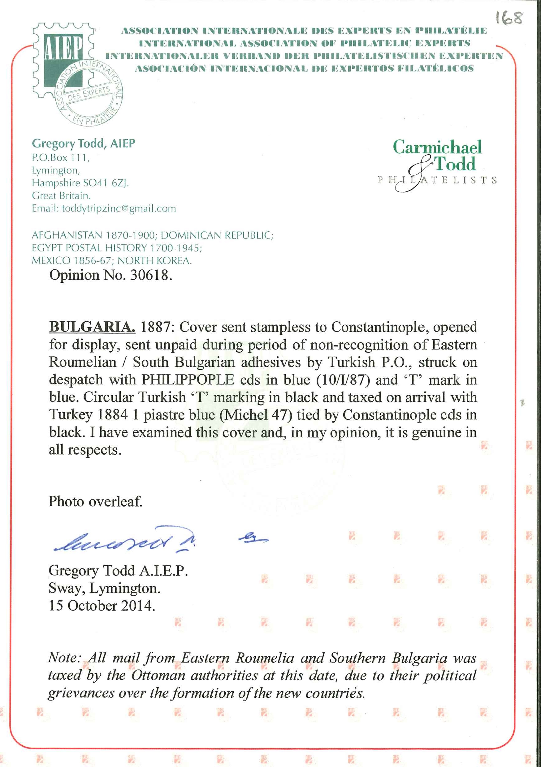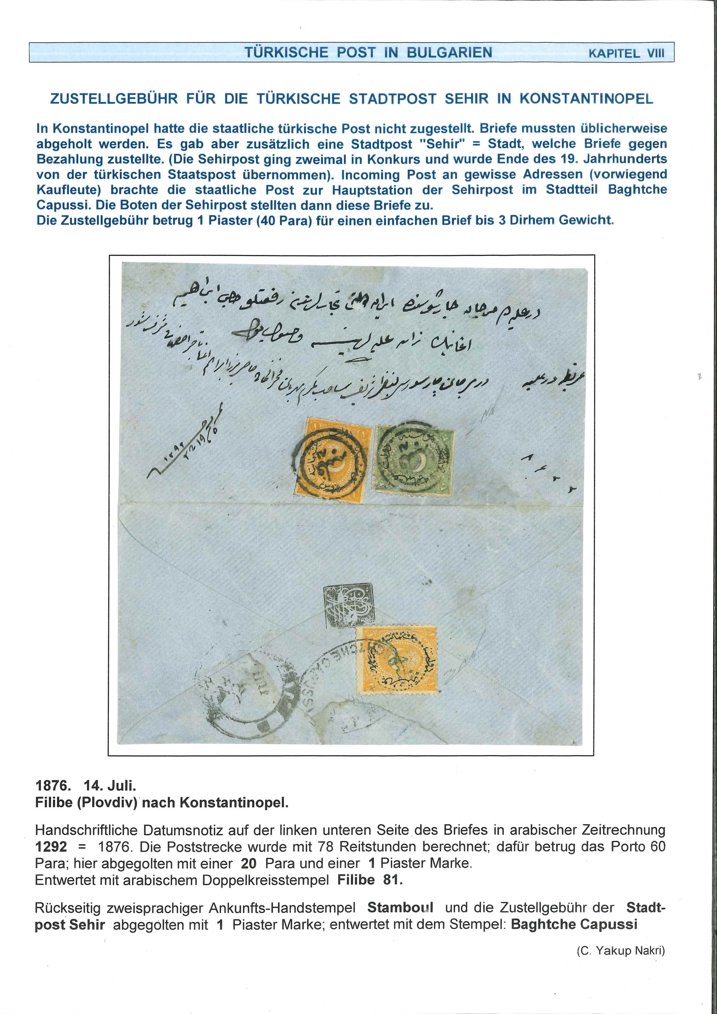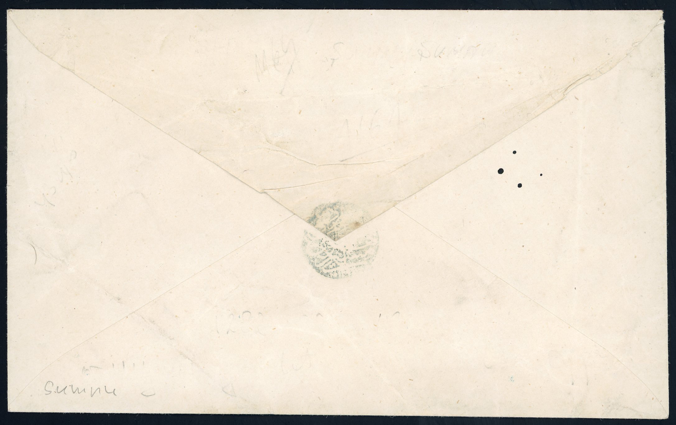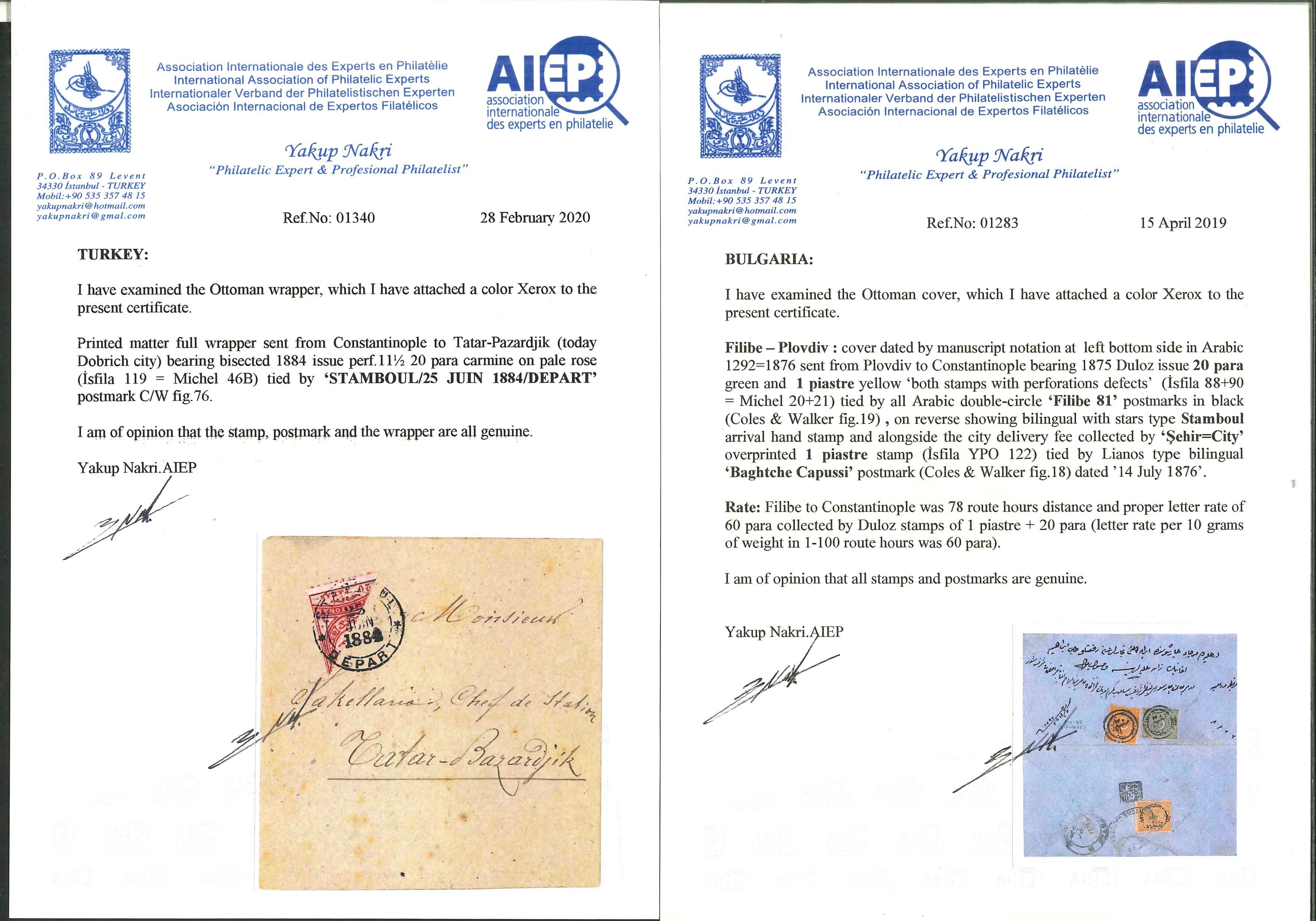 and cancelled in Galata with 5 due 20p for sea/land route via Varna; 1876 Filibe-Contantinople bearing 20p, 1pi , on reverse 1pi overprinted for city delivery fee. Also 1884 Constantinople-Tatar-Pazardijk bearing bisect 20p, tied by Stamboul Depart