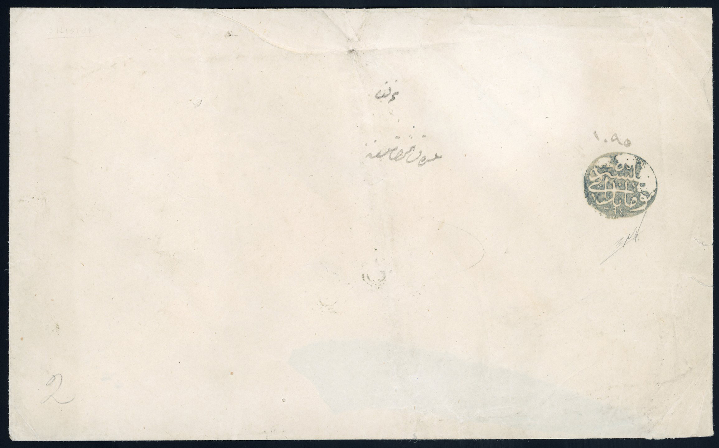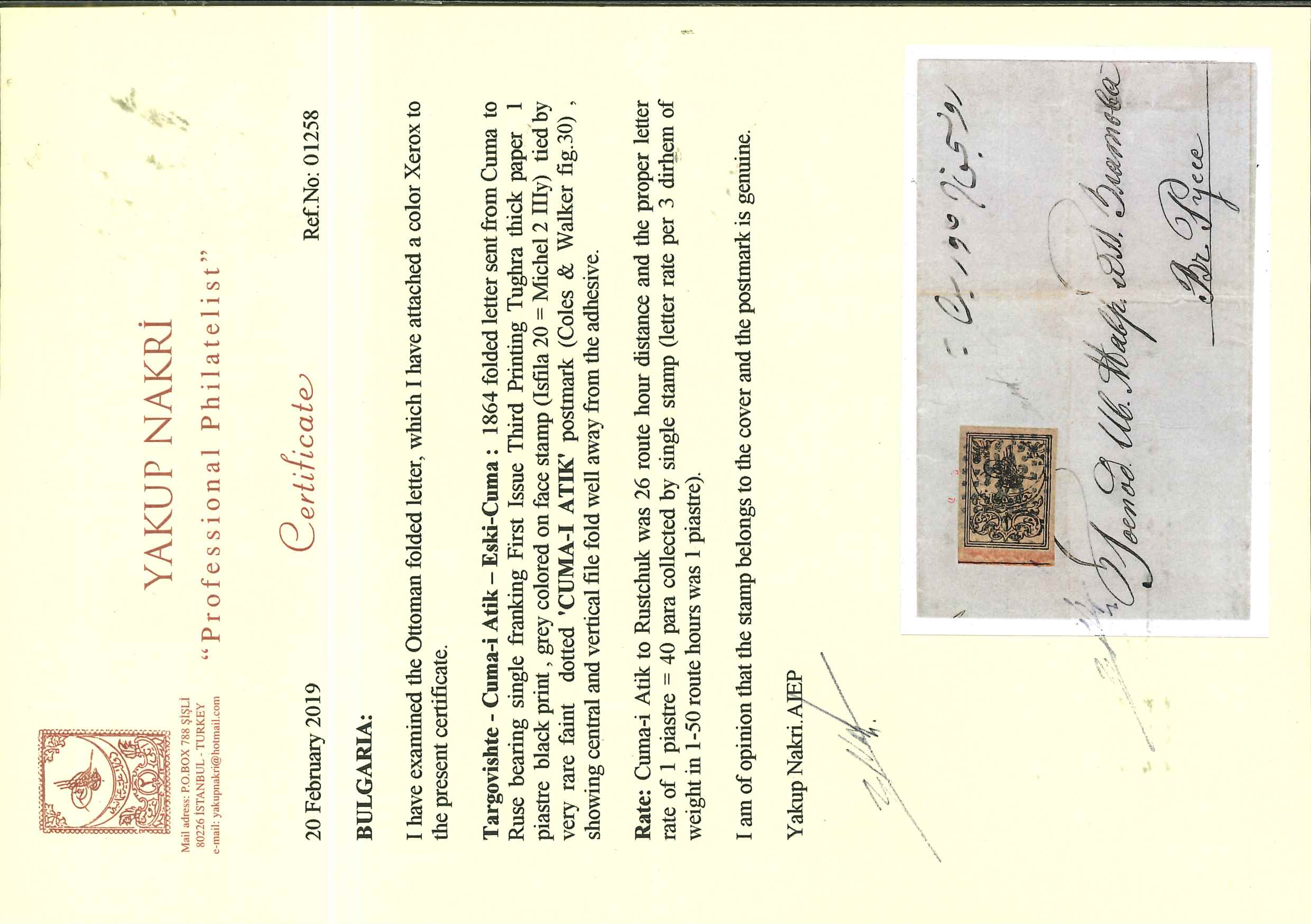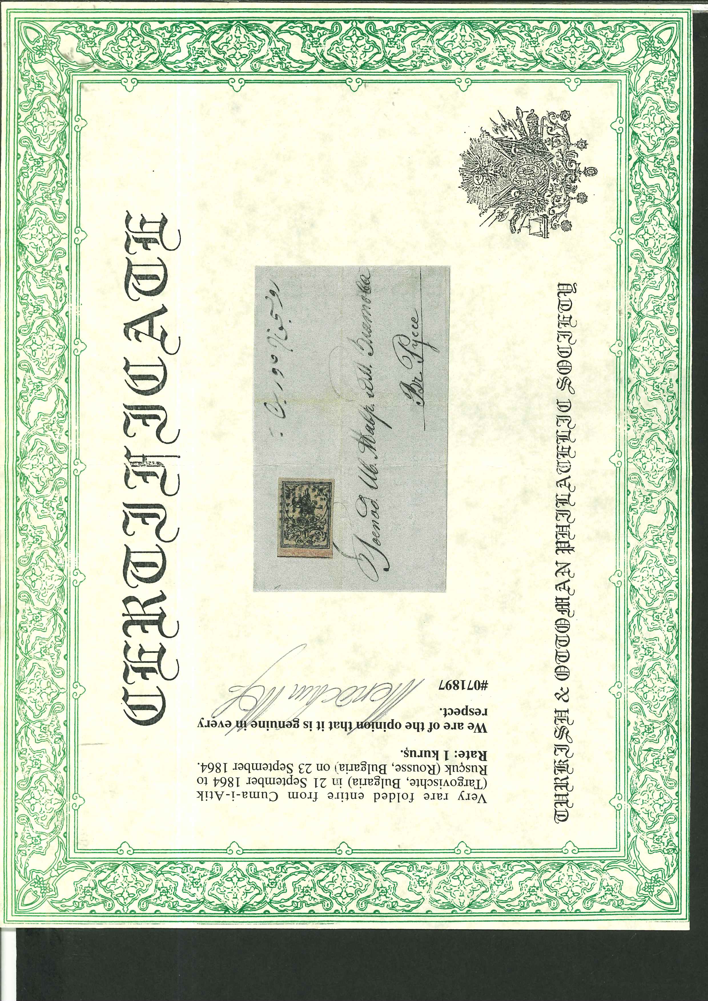 1864 (Sep 21) Turkey 1p stamp black on grey on letter Cuma-i Atik to Rustschuk, with very rare Cuma-i Atik cancellation with very few examples known. A very fine letter with vertical file fold clear of adhesive; cert. Ottoman Philatelic