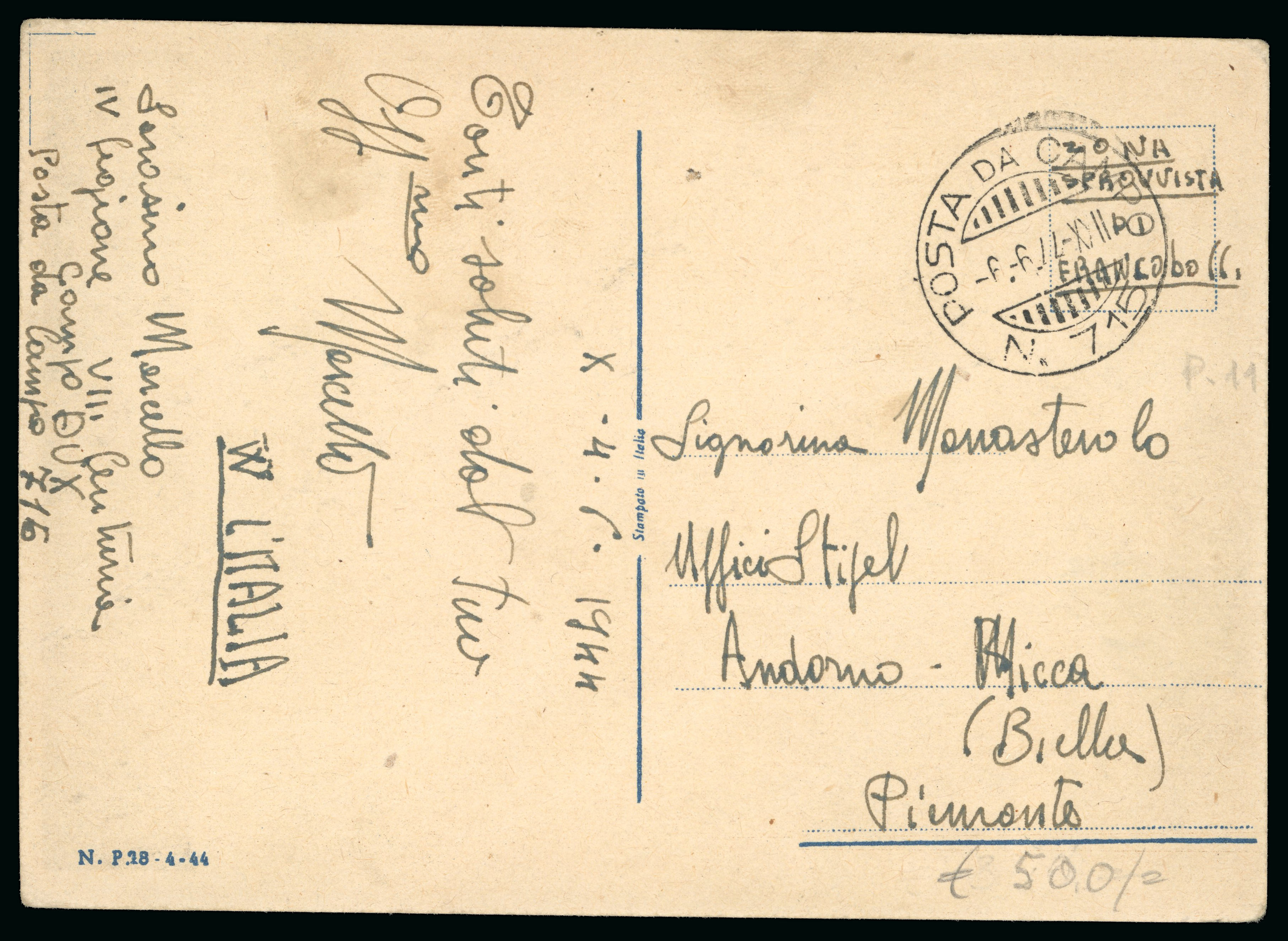 1944, cartolina in franchigia della RSI "Balilla" - "Anche tu puoi contribuire alla salvezza della patria ferita", usata con il bollo della Posta da Campo 715 (p. 10). Rara. (Image 1)