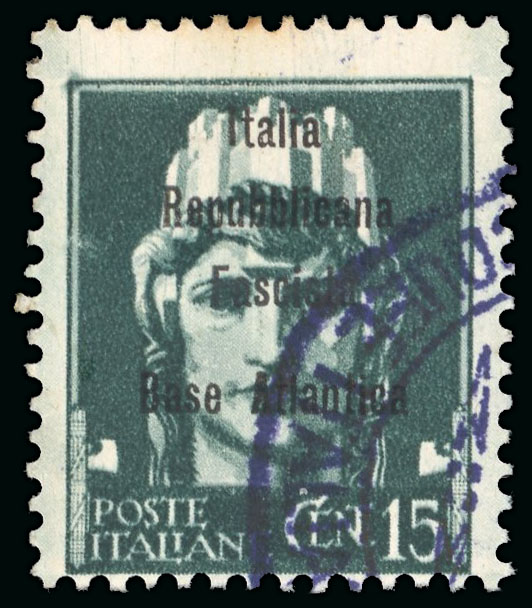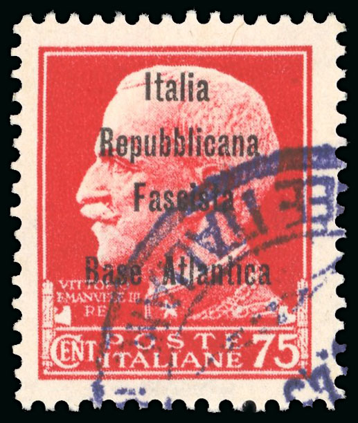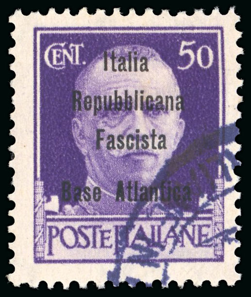 1943, Eccezionale insieme di saggi comprendente i valori "Imperiale" da 5 c., 10 c., 15 c., 25 c. 30 c., 35 c., 50 c., 75 c., 1,25 l. ed 1,75 l., soprastampa di saggio "Italia Repubblicana Fascista/Base Atlantica" in carattere bastoncino,