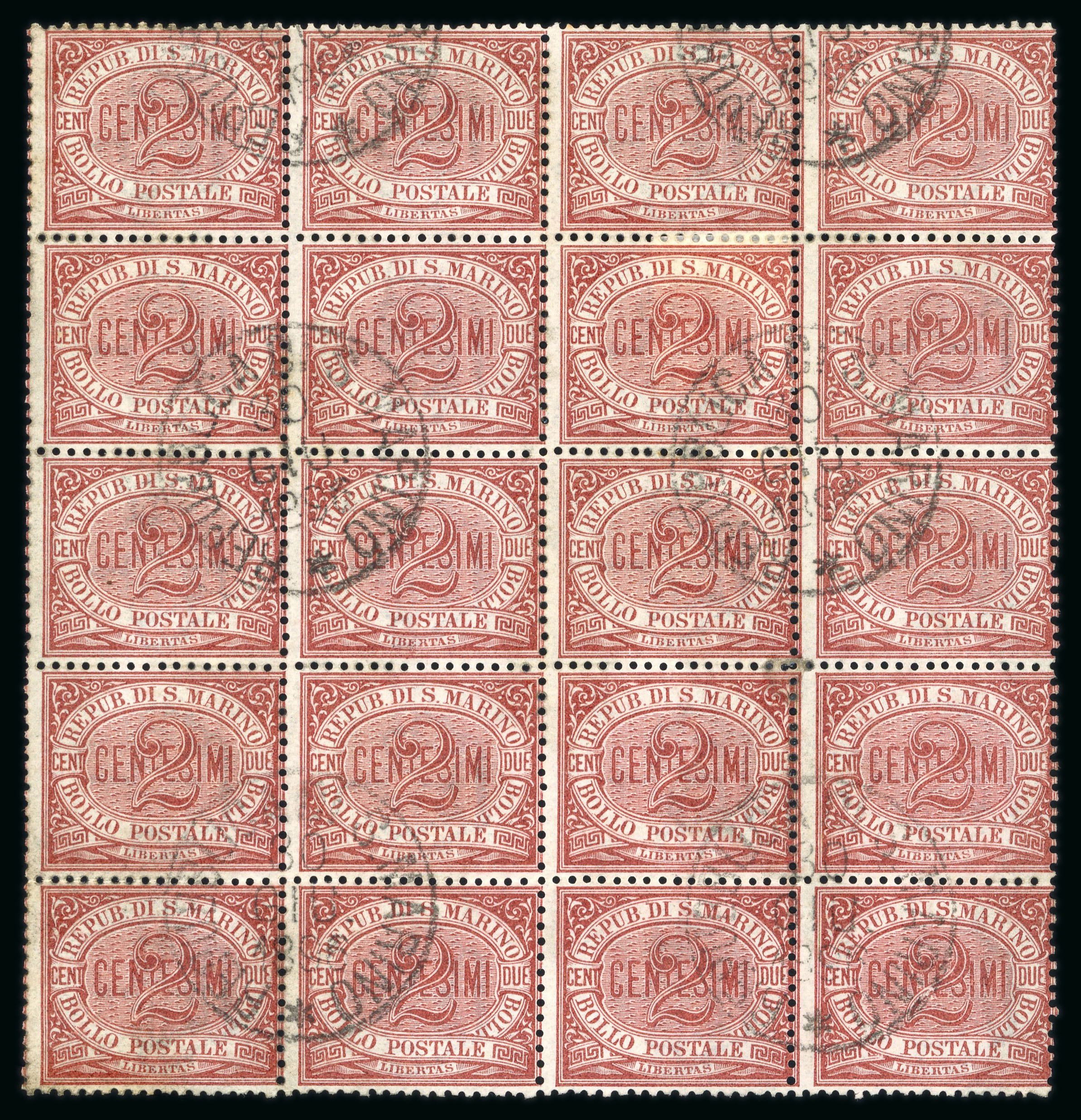 1894, Sassone n° 26, nice twenty used block stamps, not so usual well cancelled, very fine. (Image 1)