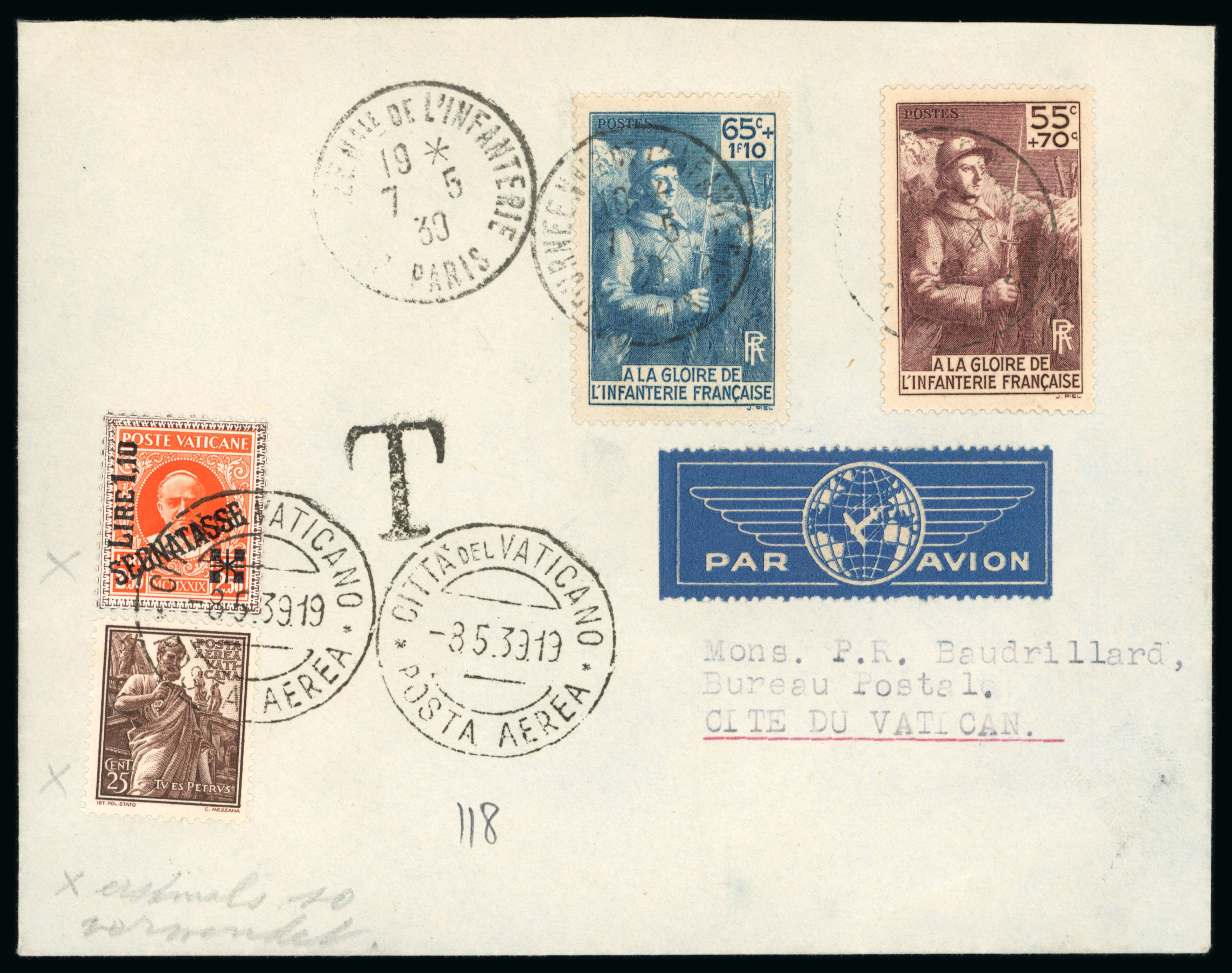 1939 (7.5.) incoming airmail cover from France bearing Legion set of two tied Paris cds, underfranked with ¨'T' handstamp and Postage Due L1.10 on 2L.50 together with 25c postage stamp applied and tied Posta Aerea cds of following day (Image 1)