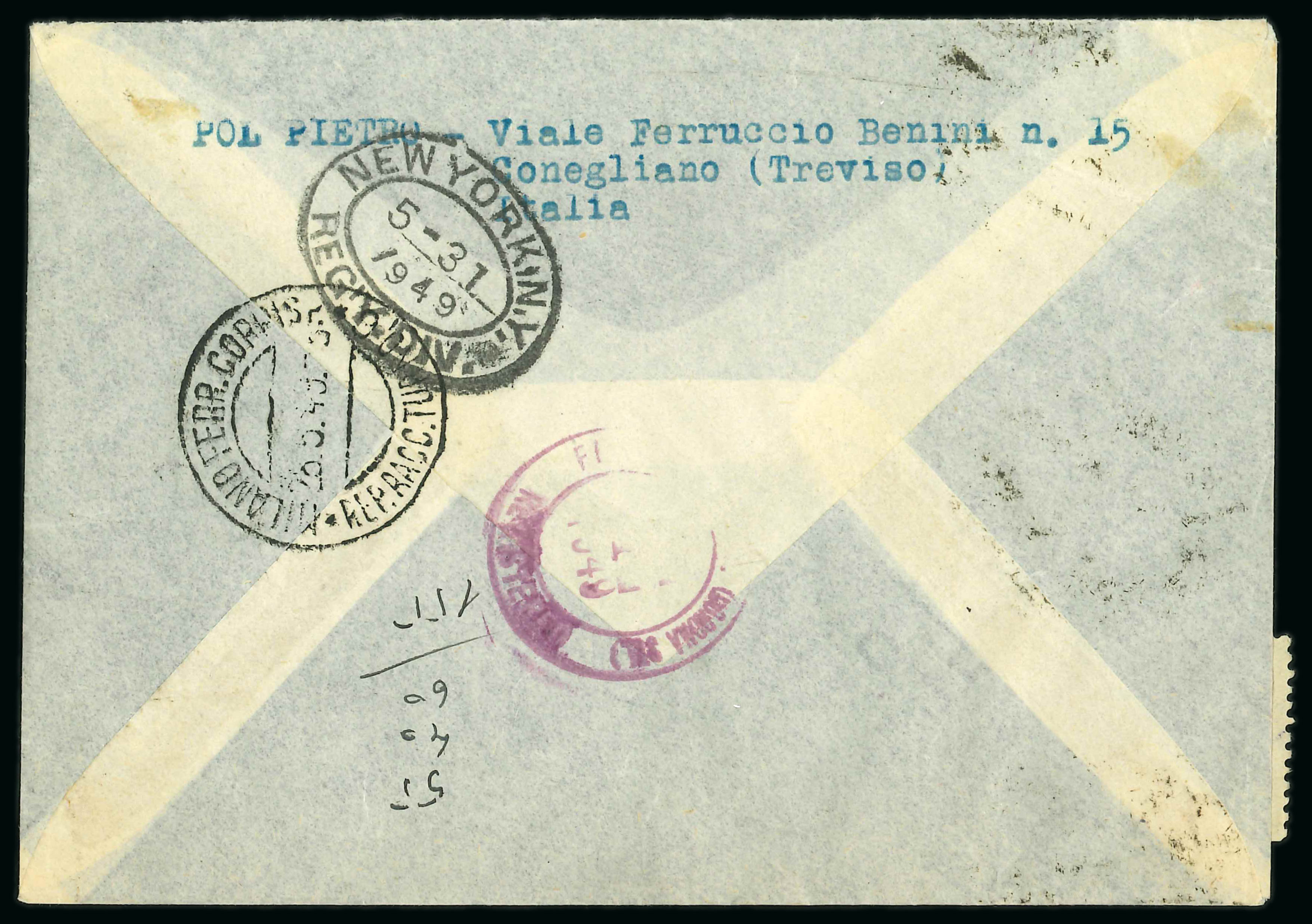 1949 (25.5.) registered cover to Dexter, Maine bearing single franking 100L Centenary of Republic tied two Genova N013 Piazza Castelleno cds, reverse with Genoa and New York transits and arrival cds (Jun 23), not used as a first day