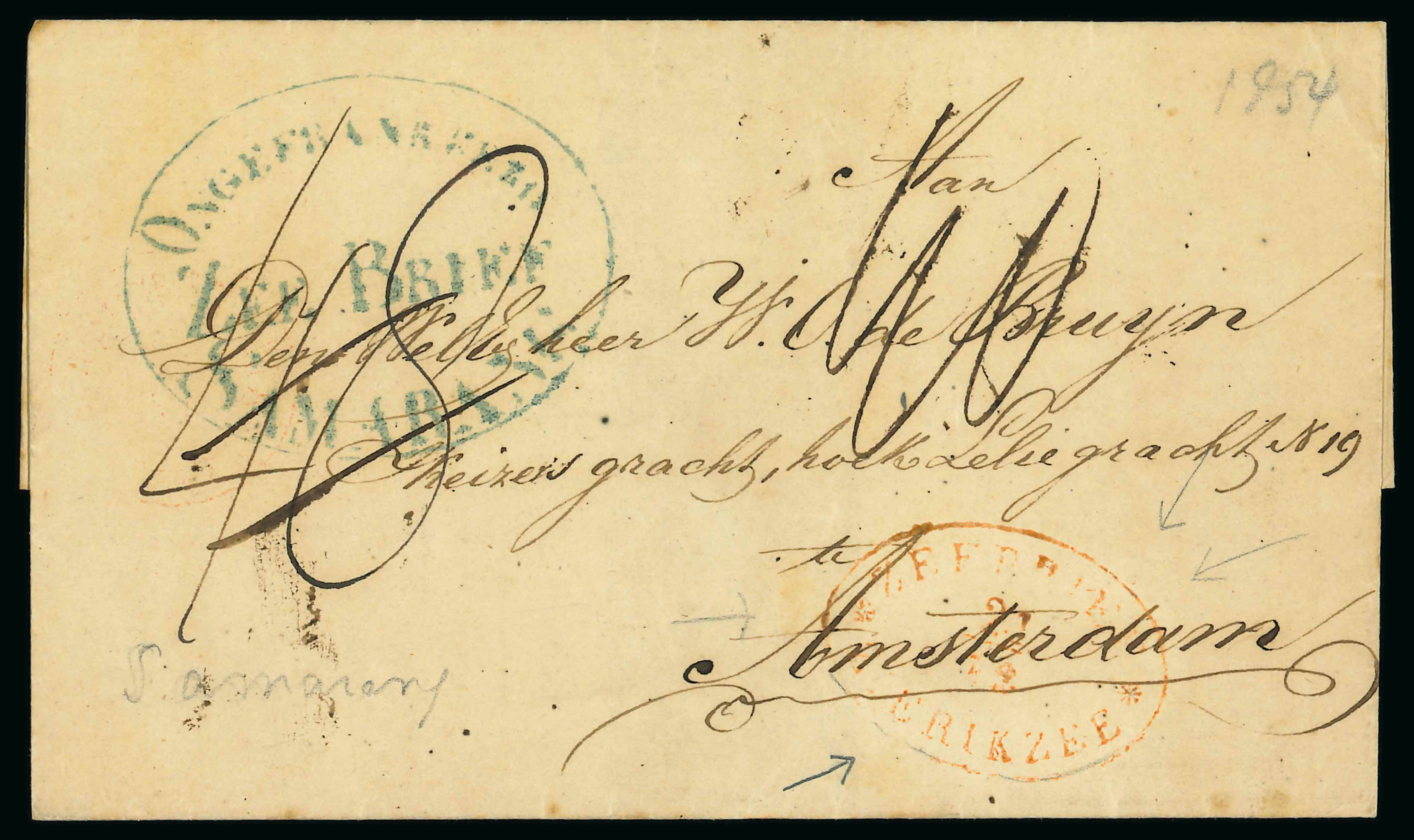 Zeebrief" postmark on 1863 overland mail to Netherlands; "Samarang Franco" on quadruple rate letter to London; overland letter sent by Messageries Imperiale; "Zeebrief Samarang" on letter with Zierikzee marking and interesting rate correction (with