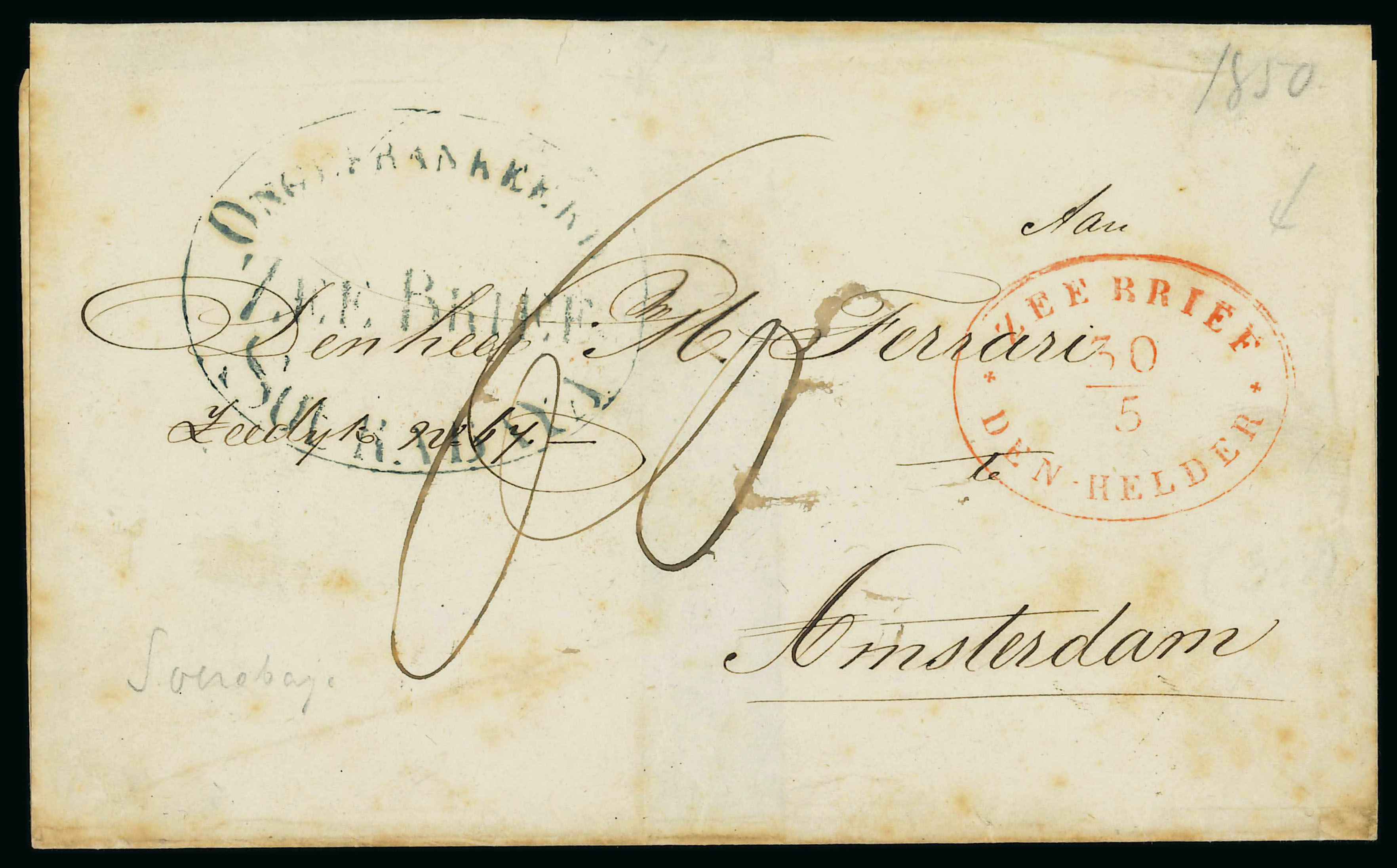 1849-1864, group of nine pre-philatelic entire letters, showing multiple routings and rates; with 4 maritime mails (zeebrief) with Dutch arrivals Den Helder, Hellevoetsluis and interesting rate and route markings; large oval "Manado
