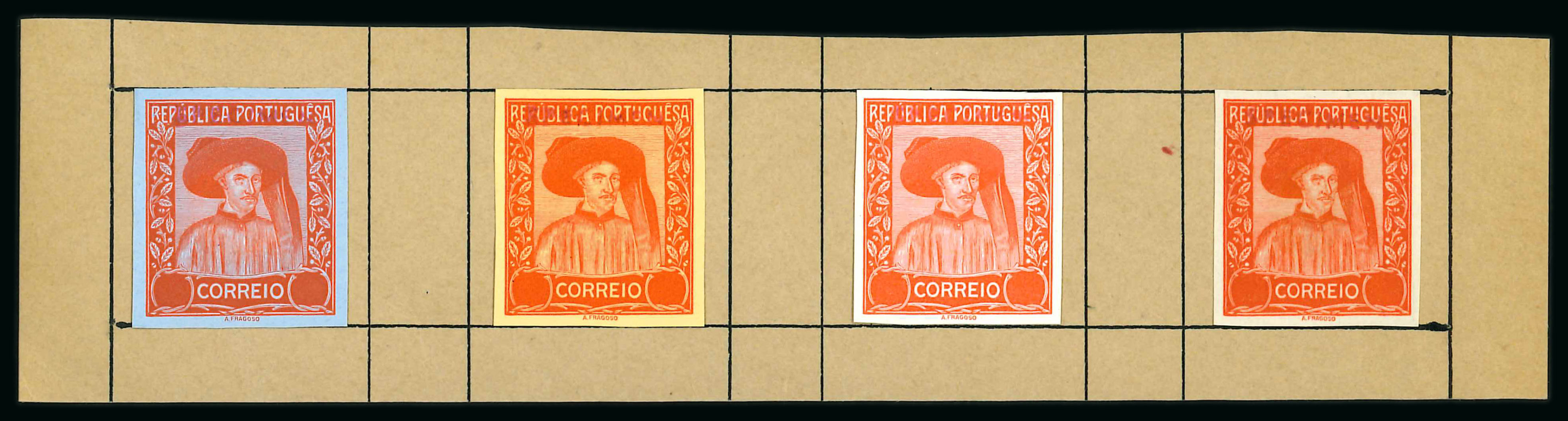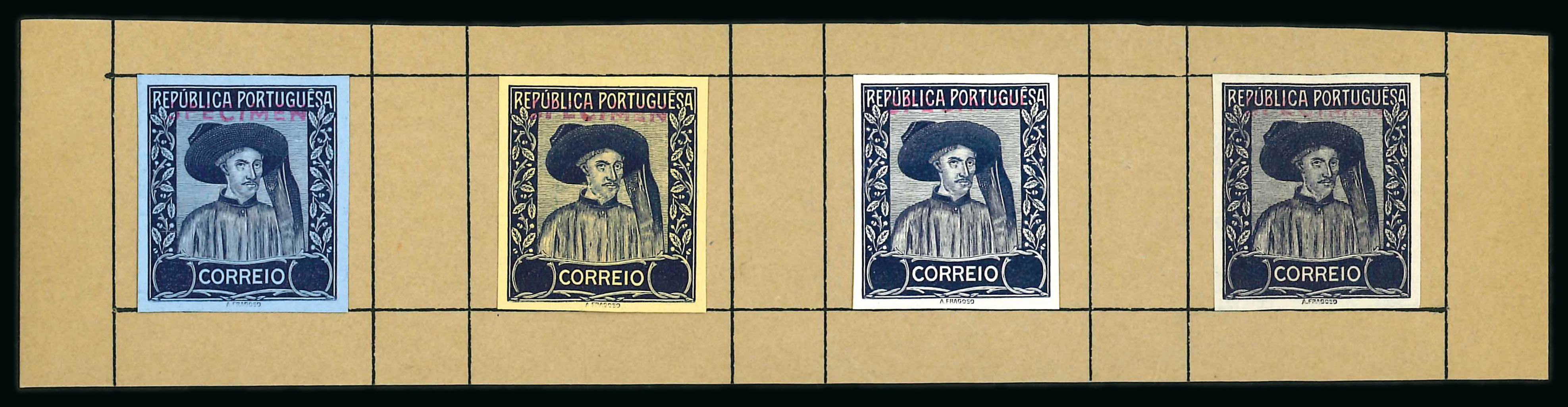 1898 group of unadopted proofs by Silva showing King Carlos in civil dress incl. presentation proof in black on glossy card mounted in card frame (noted by vendor as unique), two cut-down proofs on glossy card in black and rose (creased)