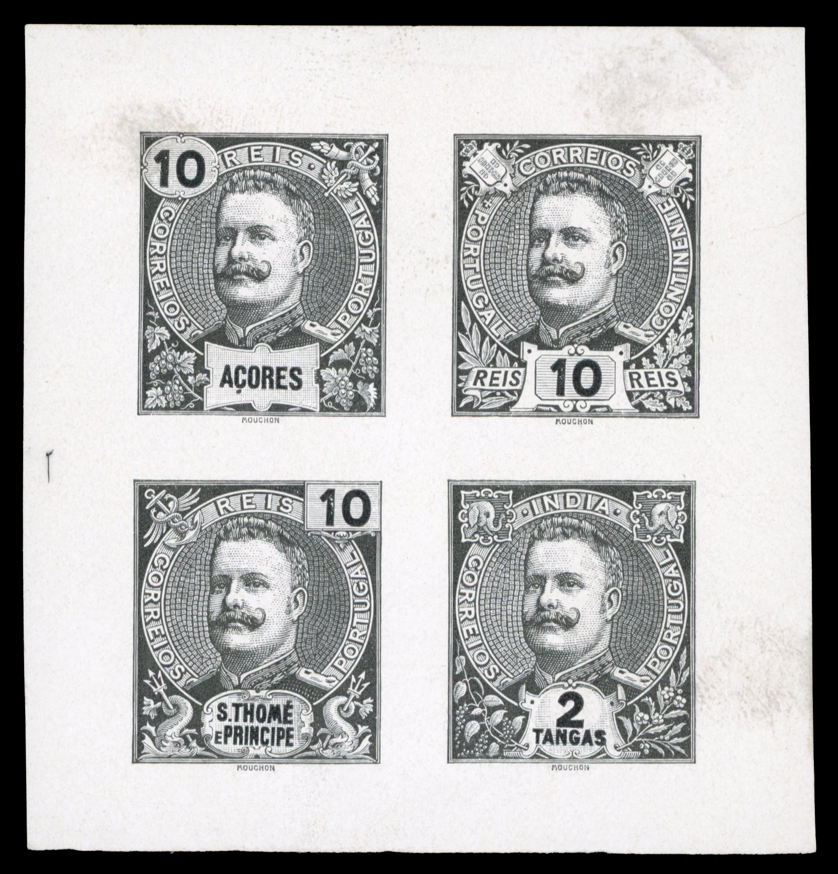 1895-1910 D. Carlos I group of five proofs, incl. blocks of eight in blue and black with designs for Portugal and the Colonies with void tablets, block of four in black with 10r for Portugal, Azores, S. Tomé and 2T for India (only one