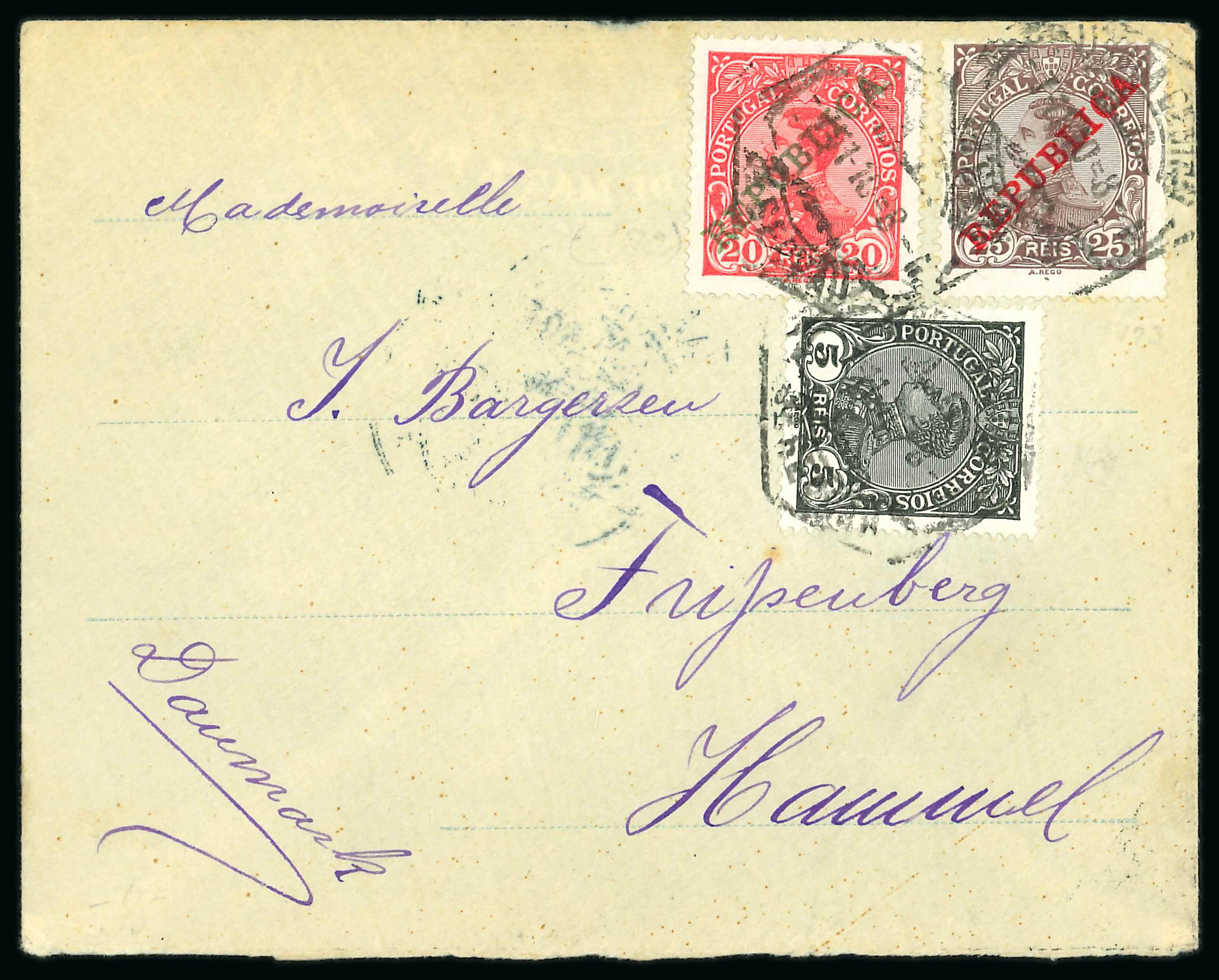 1898-1910, group of five cover D. Carlos I incl. uprated and registered stationery, 5r vertical bisect on part wrapper (said to be the only recorded by the vendor), and two examples of booklet # 2 (very scarce). (Image 1)