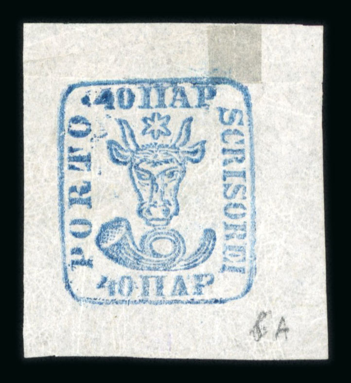 40 parale blue on white paper, a four margins example, cancelled by a fragment of the FRANCO DOROEHOI marking in green. According to Kiriac Dragomir's research, 2'056 40p stamps were used at Dorohoi. A good item, in very fine condition.