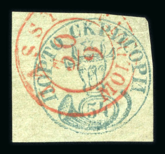 40 parale blue, featuring the elusive, superbly centered large JASSY MOLDOVA cds in red (M2 type, K. Dragomir fig. 292) dated '10/5.' This 1859 postmark was intended for use on official mail and money sendings, and therefore, it should