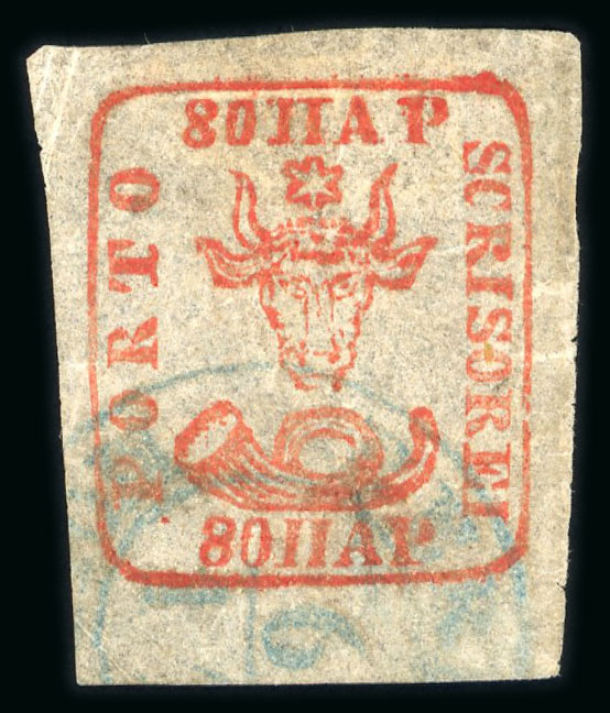 Sperati Forgery: 1858 80 parale 'Bull's Head' brick-red, fine unused example, bearing 'falsch' and 'Dr. Gmach BPP' markings in pale grey on reverse. (Image 1)