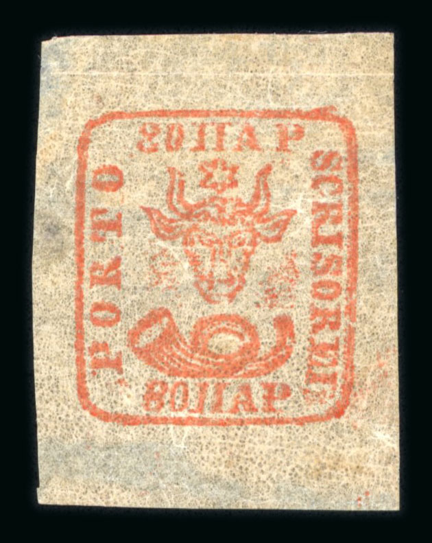revenue "Timbru Domnesc" ("Princely Stamp") of 20p was actually the first Moldavian stamp, printed at Atelia Timbrului in Iasi in 1856, the same place where the Moldavian Bull's Heads were printed in 1858 using the same press. Only one printing of