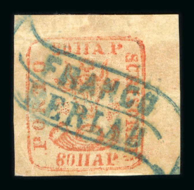 80 parale brick red on BLUISH paper on small fragment, a good to large margins example cancelled by the FRANCO TEKOUTCI decorative marking in blue. The stamp was lifted for checking and hinged into place. A scarce stamp in fine-very fine