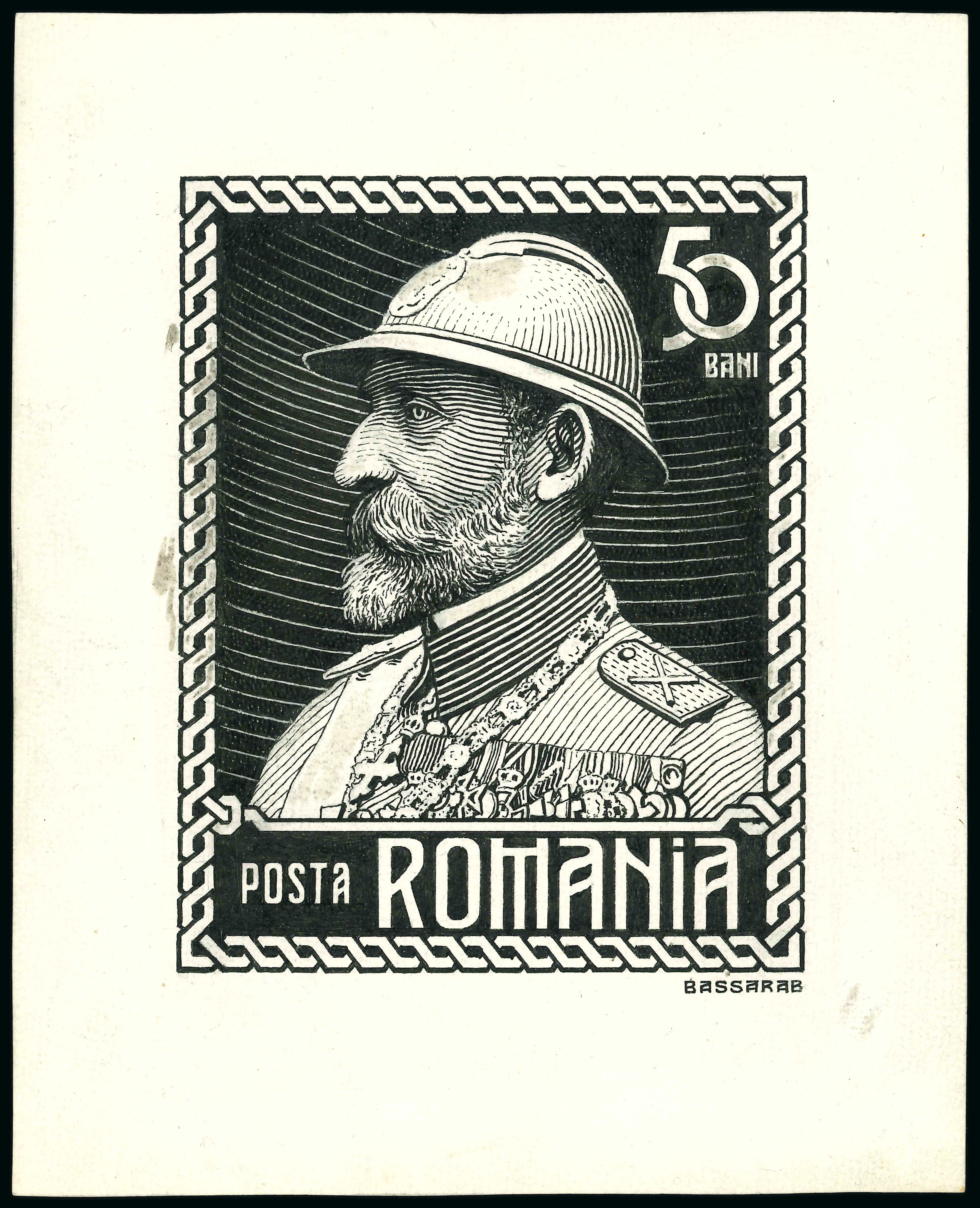 1922 Essay / original artwork (size 205 x 160 mm) in pencil and chalk on thin card by painter Ludovic Bassarab for the Coronation Issue. The 50 bani unadopted design (the frame similar to 3L issued stamp) depicts King Ferdinand in army