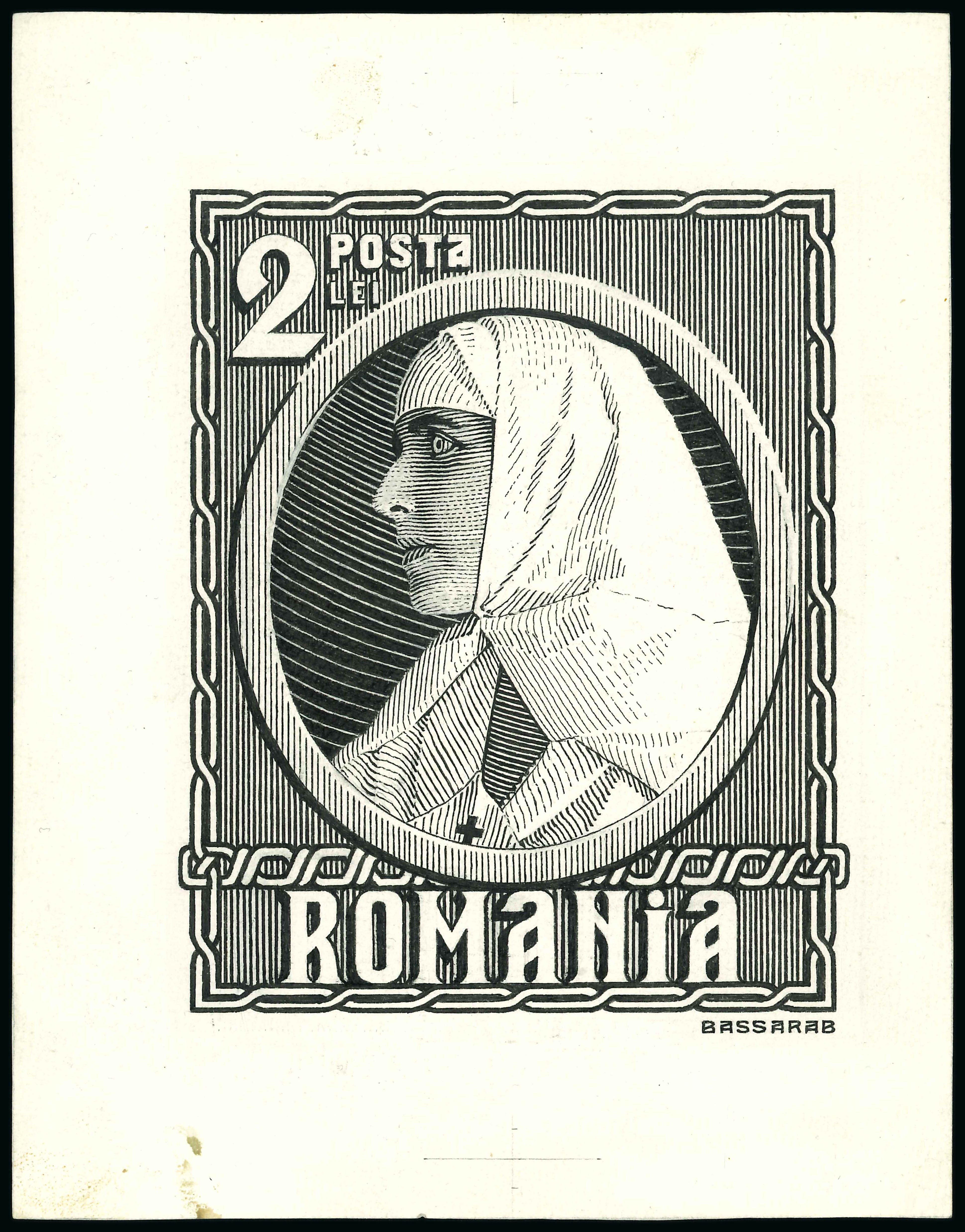 1922 Essay / original artwork (size 210 x 170 mm) in pencil and chalk on thin card by painter Ludovic Bassarab for the Coronation Issue. The 2 Lei unadopted design depicts Queen Marie as Red Cross war nurse. Very fine condition, very rare