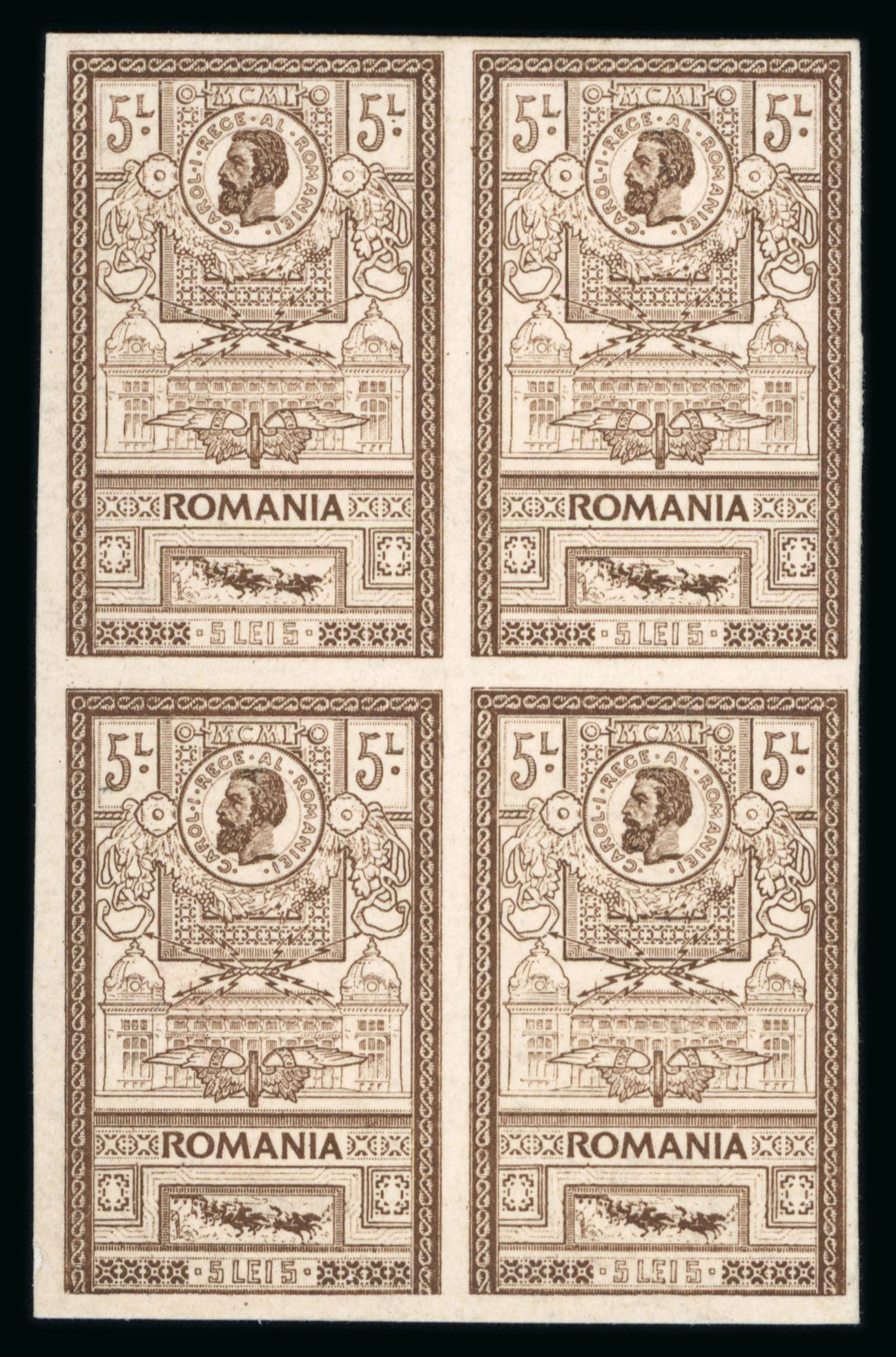 1903 Effigies, all the recorded plate proofs, in blocks of fours in black (15b, 25b, 50b & 5L) and brown (5L) on white card, fine-very fine condition. Very scarce. (Image 1)