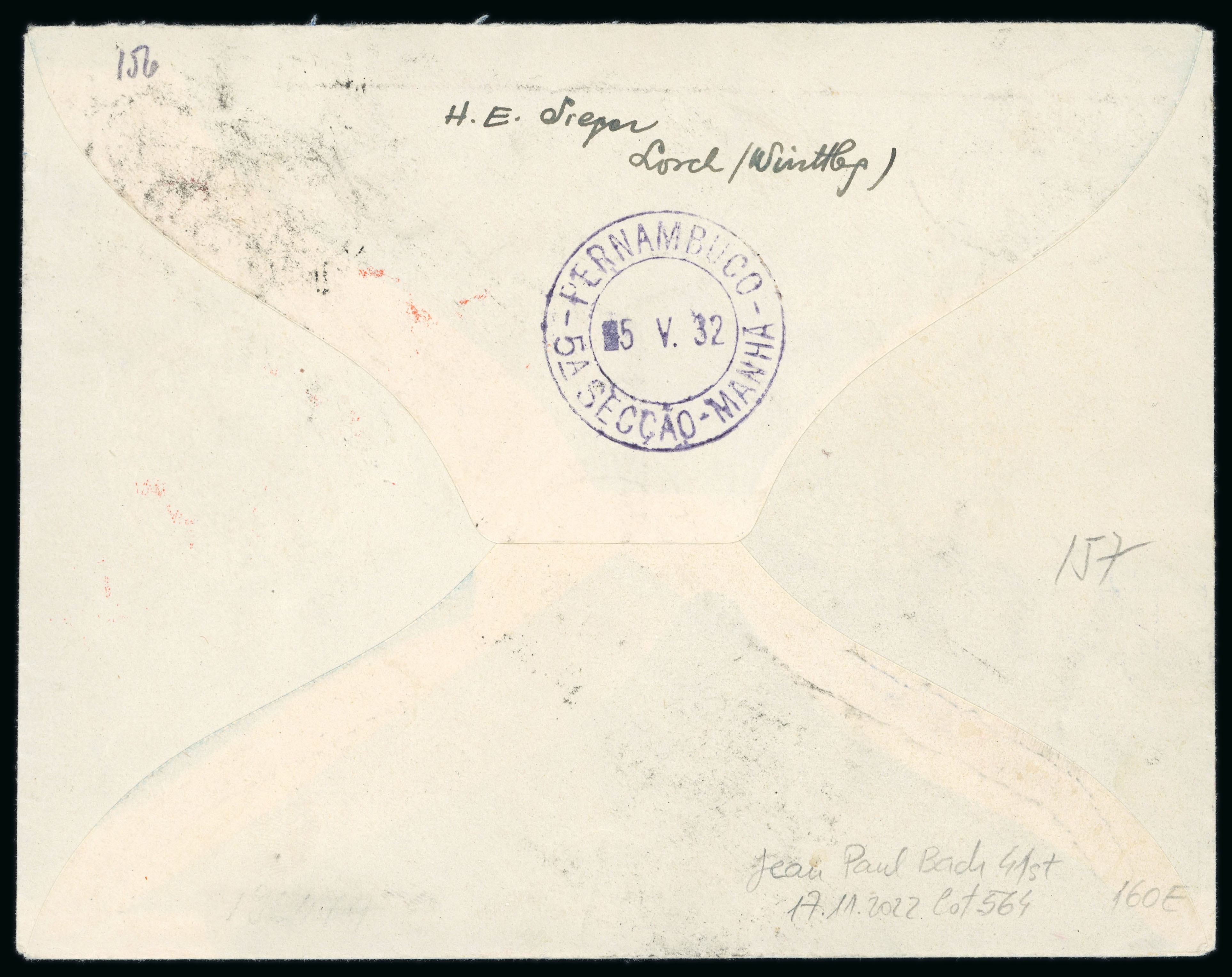 postmark of the 4th South American flight in orange-brown and the arrival special confirmation marking in violet. Very fine, scarce. (Image 1)